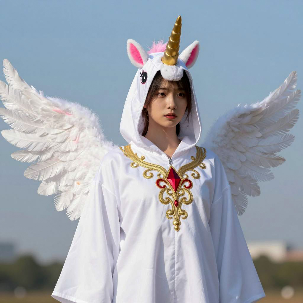 Unicorn angel costume, photorealistic, young woman, unicorn costume, white hooded robe, pink unicorn ears, golden horn, white feathered wings with pink tips, ornate gold and red embroidery on chest, standing outdoors, daytime, clear blue sky, neutral expression, natural light, detailed costume, realistic ures, fantasy theme, digital art, portrait, medium shot