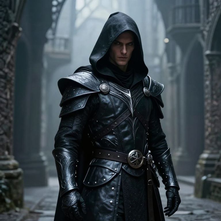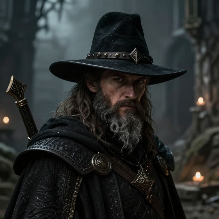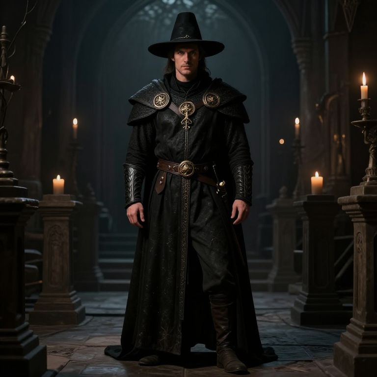 Accolades full body, a gamemaster of DnD with nice black hat, hyper detailled, hyper realistic, 8k, medieval fantasy world, dark theme,