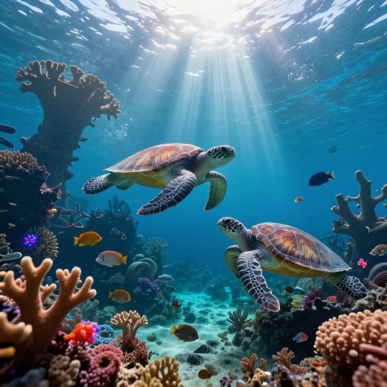 Envision an entrancing underwater tableau reminiscent of Salvador Dali's whimsical color palette and surrealistic imagery, captured through the unique lens of a 'bug's-eye view' perspective. In this mesmerizing realm, intricate coral formations adorned with luminescent sea creatures give rise to fantastical landscapes that seem to challenge conventional reality. The harmonious interplay between light and shadow engenders an ambiance of serenity and intrigue as sunlight gently pierces the oceanic depths, casting ethereal illumination upon the placid visages of majestic sea turtles and inquisitive fish navigating these enigmatic environments. This hyper-realistic digital composition masterfully blends Dali's signature surrealism with the captivating allure of marine life, beckoning viewers to delve into a spellbinding fusion of fantasy and natural splendor.