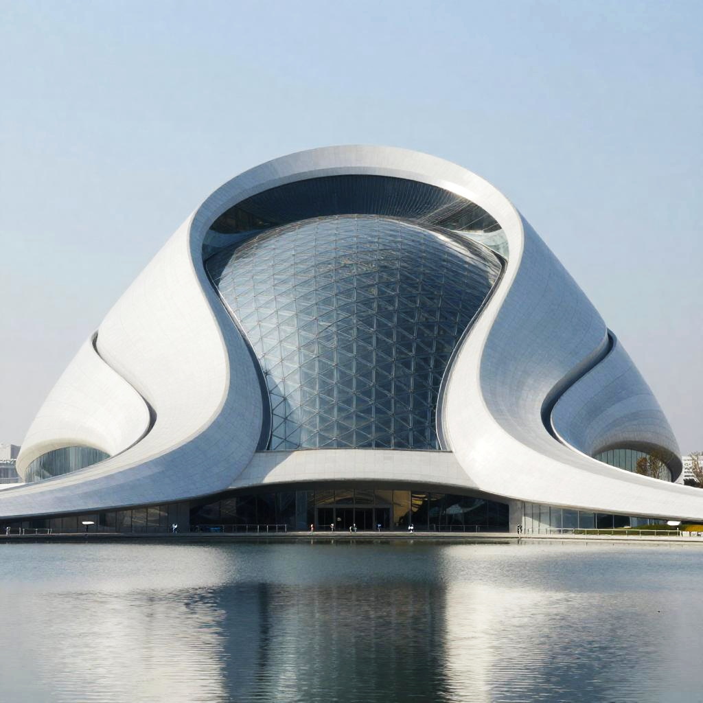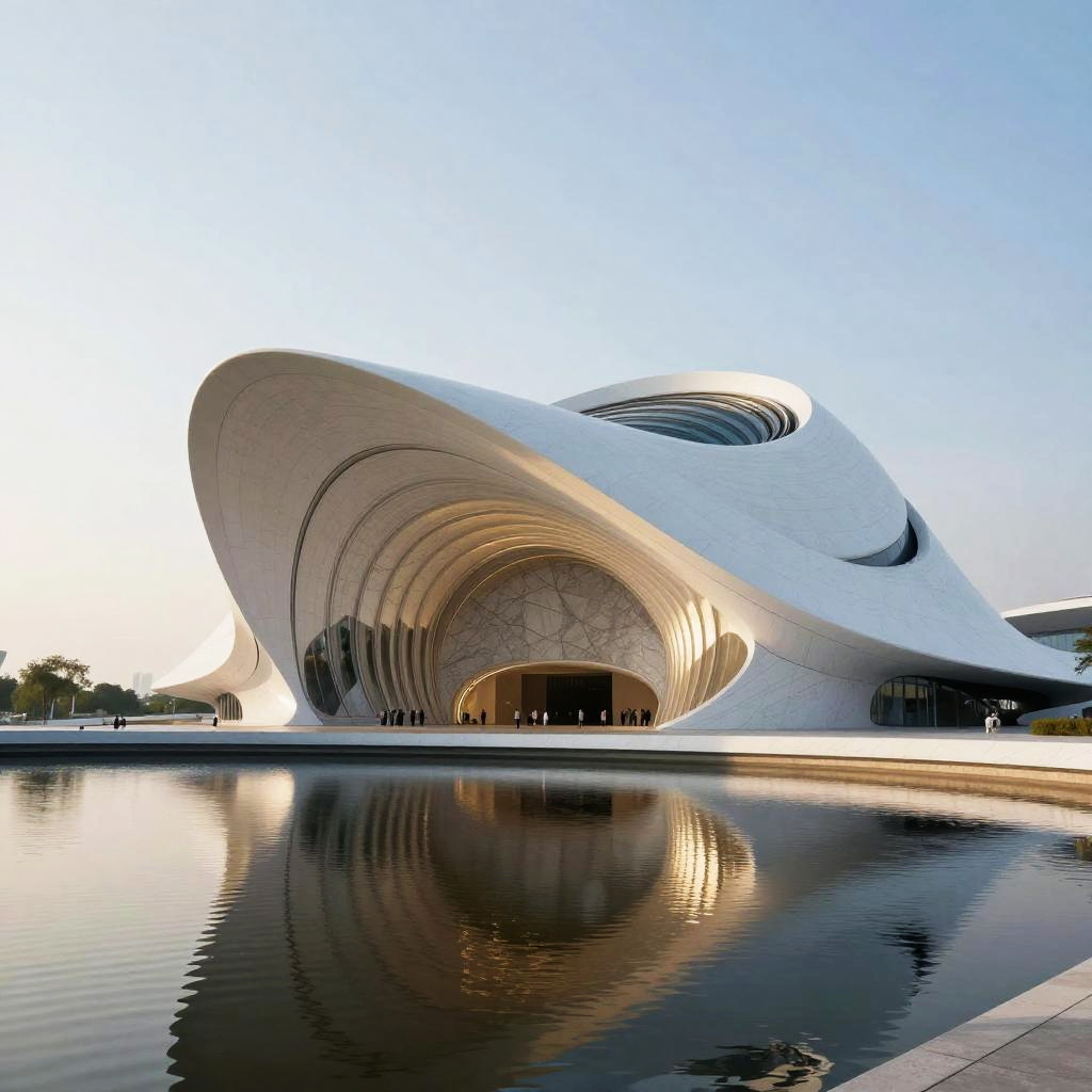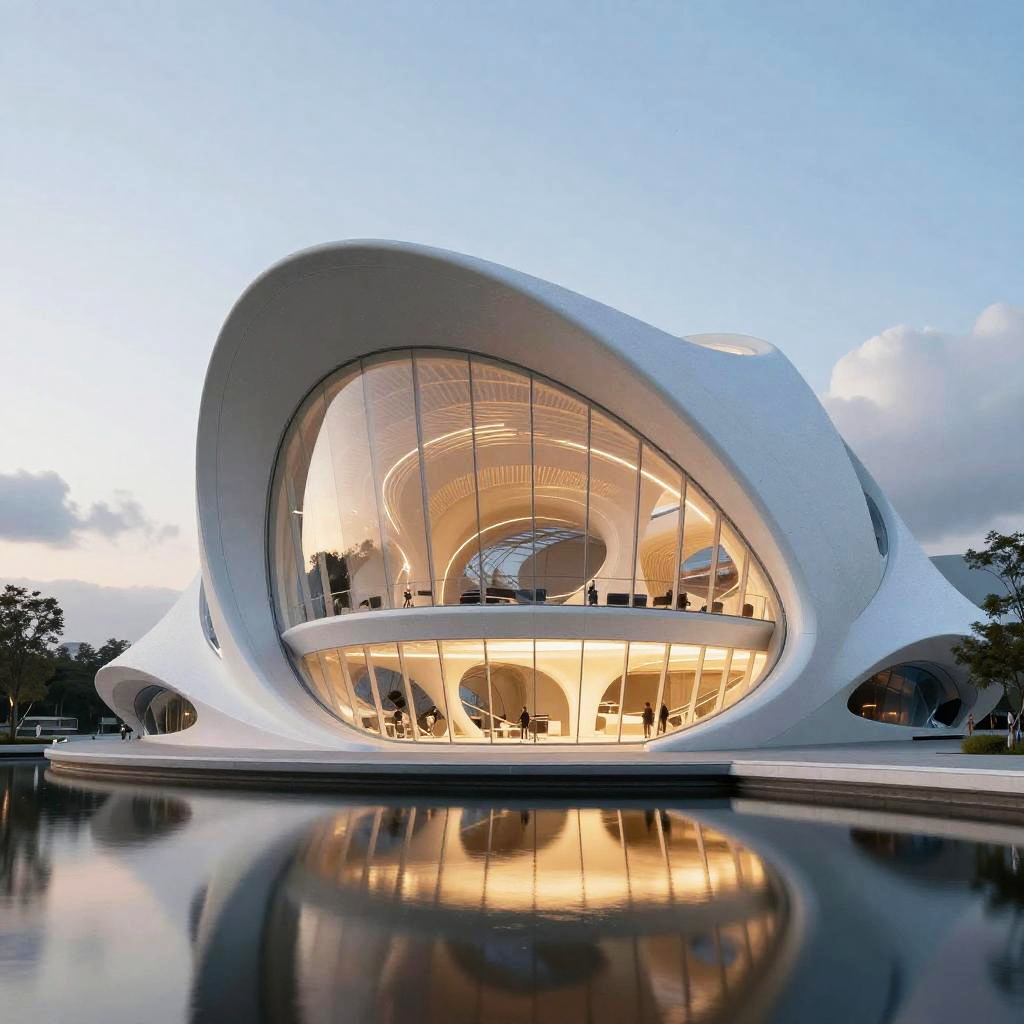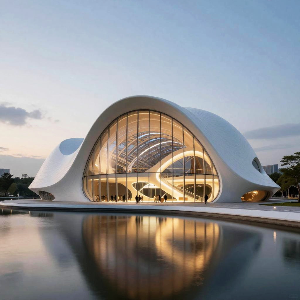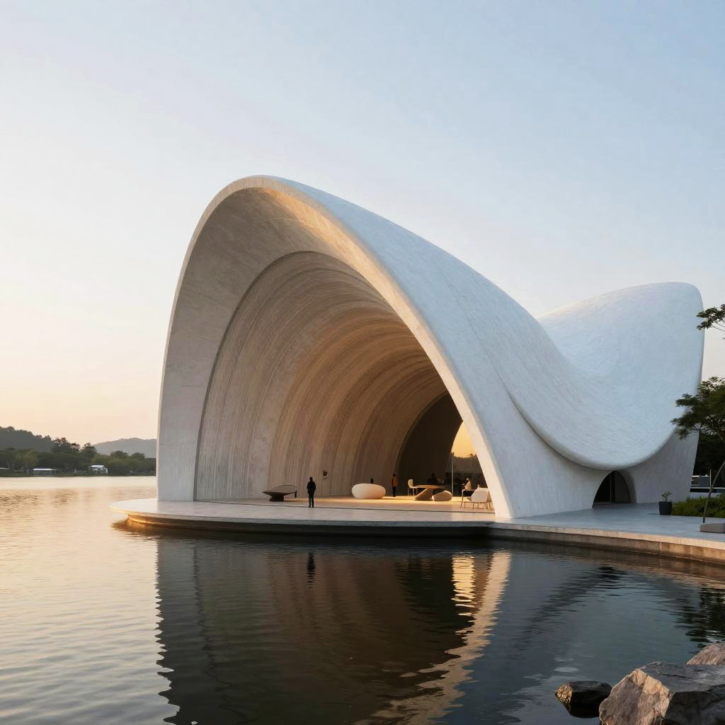 White foam shaped building on the calm lake, human perspective, future, interior wood, award-winning, highly detailed 4k art, midnight, unreal engine highly rendered, global illumination, radial light, internal environment by Zaha Hadid