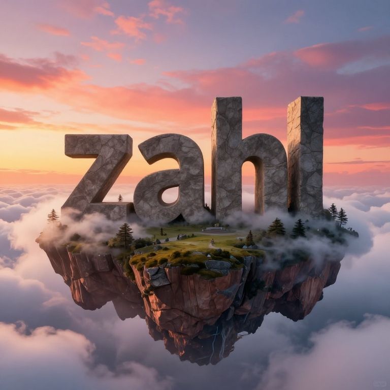Zahl, surreal scene of a floating island with giant stone sculptures of the word 'zahl' surrounded by swirling clouds, vibrant sunset sky, mystical and dreamlike atmosphere, detailed landscapes