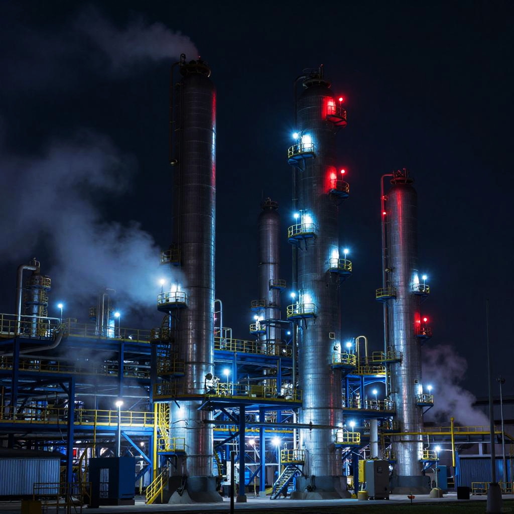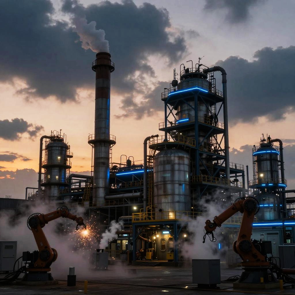 Fasber industrial complex at sunset, futuristic factory with towering smokestacks, neon blue lights illuminating metal structures, steam and sparks flying, cyberpunk style, detailed machinery and robotic arms, dark clouds swirling overhead, moody atmosphere
