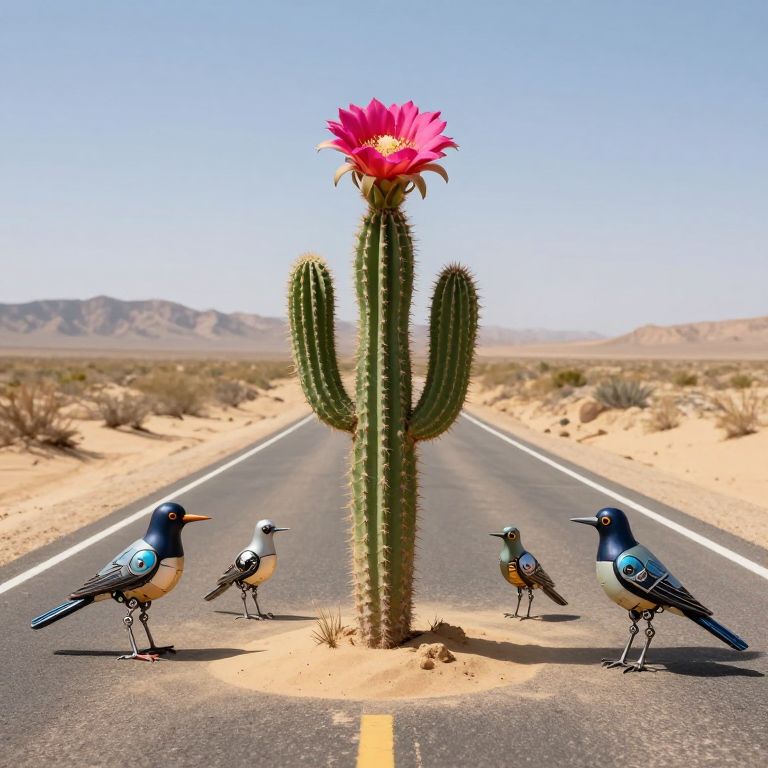 A surreal desert highway is interrupted by a blooming cactus adorned with a vibrant flower, surrounded by whimsical, mechanical birds that seem to emerge from the sand, defying the mundane reality of the arid landscape.