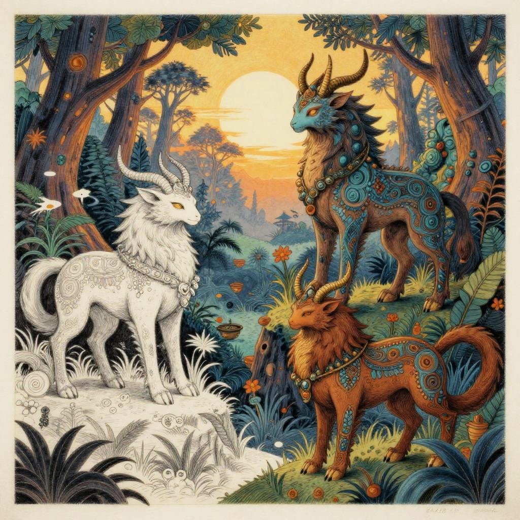 Art drawing AI producing a vibrant and detailed fantasy art piece, integrating traditional sketch elements with AI-generated patterns, depicting mythical beings and enchanted forests under a glowing twilight.