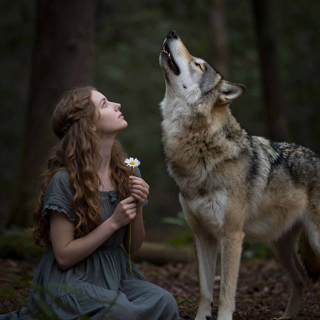 Photograph of a curly-haired woman in a gray dress holding a daisy, kneeling in a forest, gazing at a howling wolf.