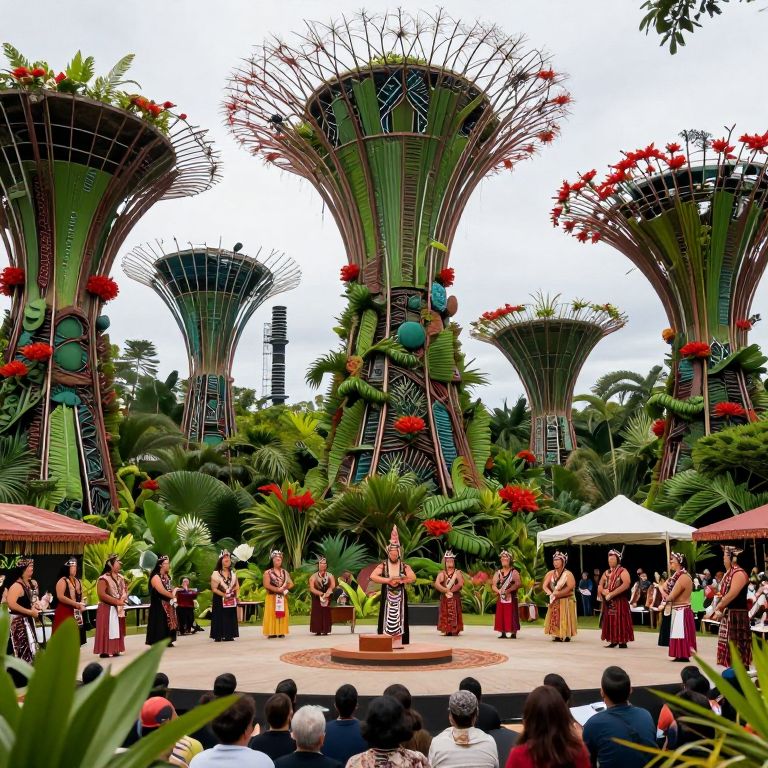 A futuristic forest city with tall, green structures and vibrant red flowers, hosting a Maori cultural event.