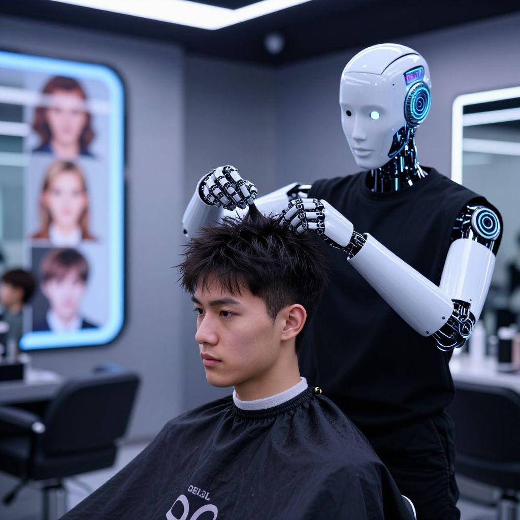 Which hairstyle suits me male AI, a creative depiction of an AI robot gently styling a male customer's hair in a futuristic salon, glowing lights highlighting multiple virtual hairstyle previews, highly detailed and vibrant color palette, blending human and technology elements