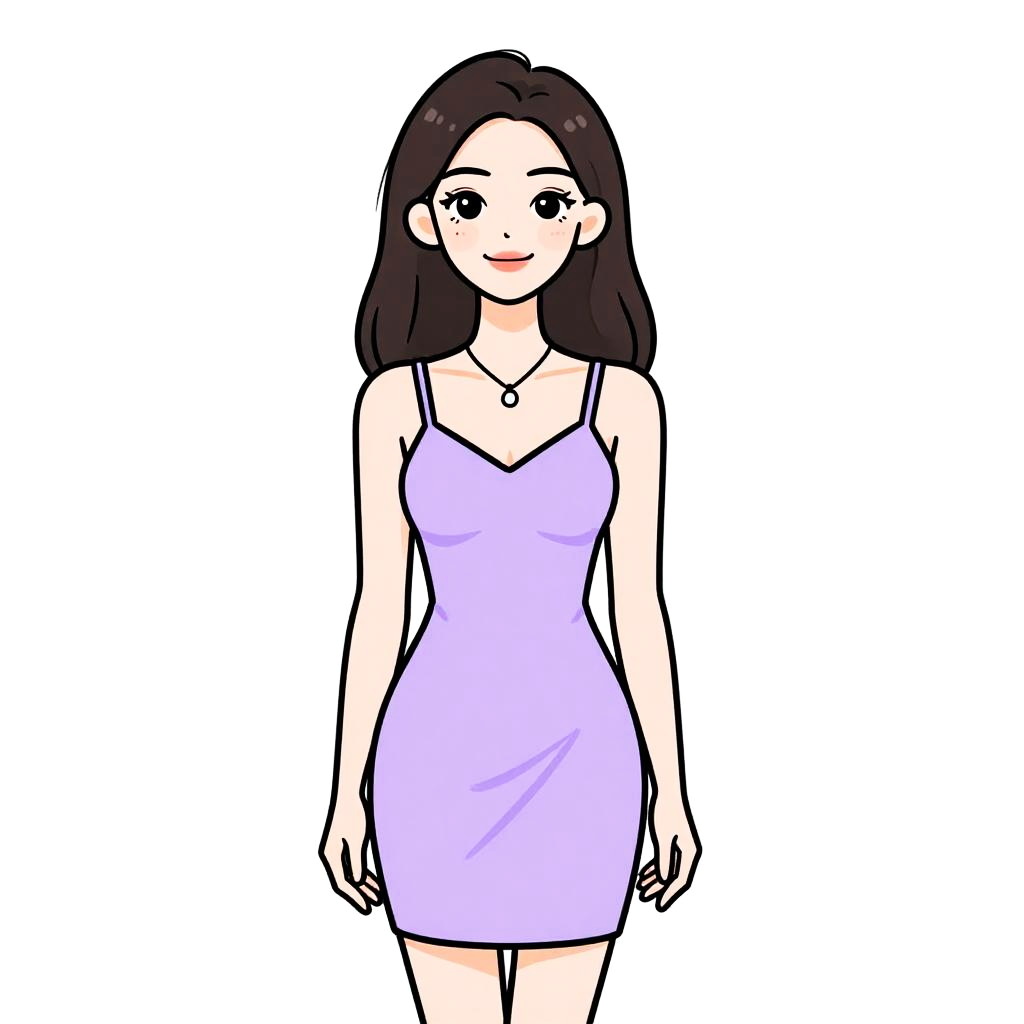 This is a digital drawing of a young woman with fair skin and short, dark brown hair, styled in a bob cut. She has large, expressive brown eyes and a subtle smile. She is wearing a sleeveless, navy blue dress with a deep V-neck and a thigh-high slit on her left side. The dress has a fitted, slightly flared design. She is also wearing black, flat, slip-on shoes. The background is plain white, making the subject the clear focus of the image. The drawing style is clean and minimalist, with bold lines and flat colors, reminiscent of anime or manga art.