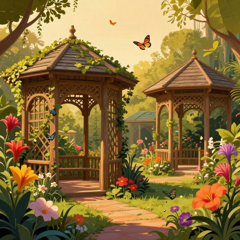 Prosperity illustrated through a flourishing garden overflowing with blooming flowers, ripe fruits, and winding vines under a clear blue sky, a shimmering river flowing nearby symbolizing continuous growth, warm golden tones evoking feelings of wealth, health, and happiness.