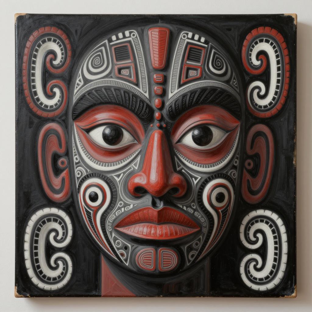 Retro-Style Robert Motherwell - Elegy to the Spanish Republic No. 110, 1971. Acrylic with graphite and charcoal on canvas, Maori style, Polynesian influence, depth of field, facial symmetry, epic composition, 8k, UHD, sharp focus, natural light, photo realistic, maximum texture, real skin texture, HDR, High octane render, Unreal engine 5, DSLR, highly detailed, ray tracing, Cinematic, Photoshoot, 32k, Ultra-HD, Super-Resolution, Cinematic Lighting, Volumetric Lighting, photo hyper-realistic, photorealistic, intricate details, high detail, octane rendering, high quality, red black and white,