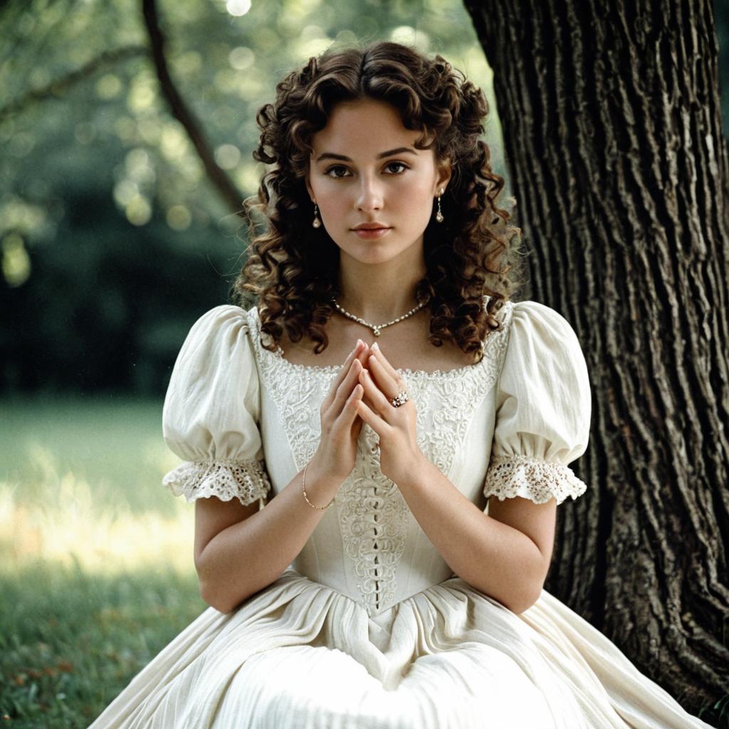 Portrait of a young woman with curly brown hair wearing a late Victorian era white dress with puffed sleeves and lace details. She is sitting outdoors by a tree, with her hands held together, adorned with rings and pearl jewelry. The background is blurred greenery, creating a soft natural setting.