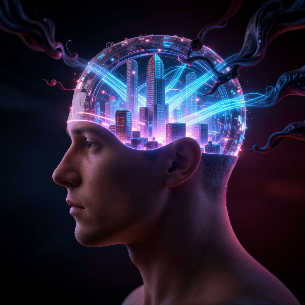 Photorealistic CGI of a side profile male head with a glowing, neon cityscape inside, surrounded by blue and purple energy lines. Dark background.