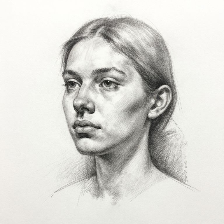 Monochromatic pencil drawing of a serious young woman with light hair, soft shading, and realistic features, facing slightly to the left.