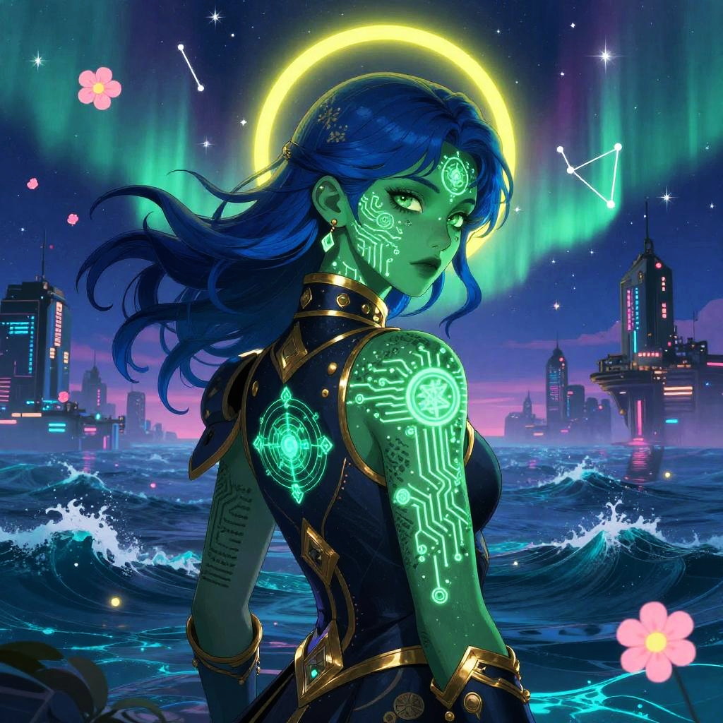 Surreal, vibrant portrait of novan, a rebellious youth with flowing cobalt hair and matte jade-green skin covered in glowing circuit tattoos, set within a floating tech metropolis shimmering over an endless sea of neon-lit waves beneath aurora skies. They wear an ornate dark uniform with gold accents and arcane sigils; a radiant yellow halo crowns their head as stars scatter across a cobalt sky. Pink flowers drift among constellations, luminous hues, dreamy atmosphere, sleek sci-fi baroque with sharp contrasts, glowing digital motifs, and crisp linework.