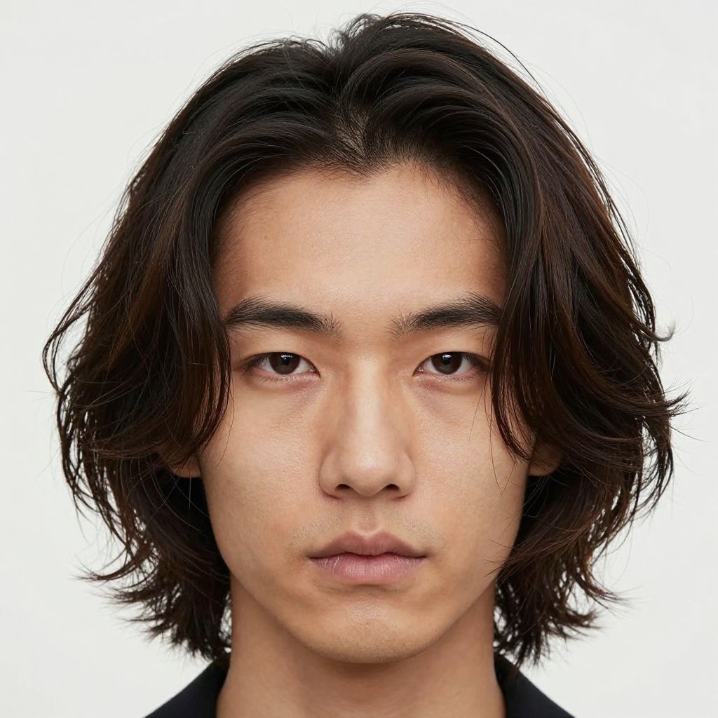Photograph of an Asian man with medium-length, wavy black hair, light skin, and neutral expression, against a plain white background.