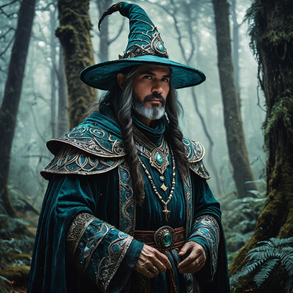 Closeup portrait of an ancient forest mage standing in a misty, enchanted woodland. The mage wears a richly detailed dark green robe and an ornate pointed hat adorned with intricate silver embroidery and turquoise gemstones. He has long gray hair, a full gray beard, and holds a gnarled wooden staff. The background features tall trees with moss-covered trunks and ferns, enhancing the mystical atmosphere.