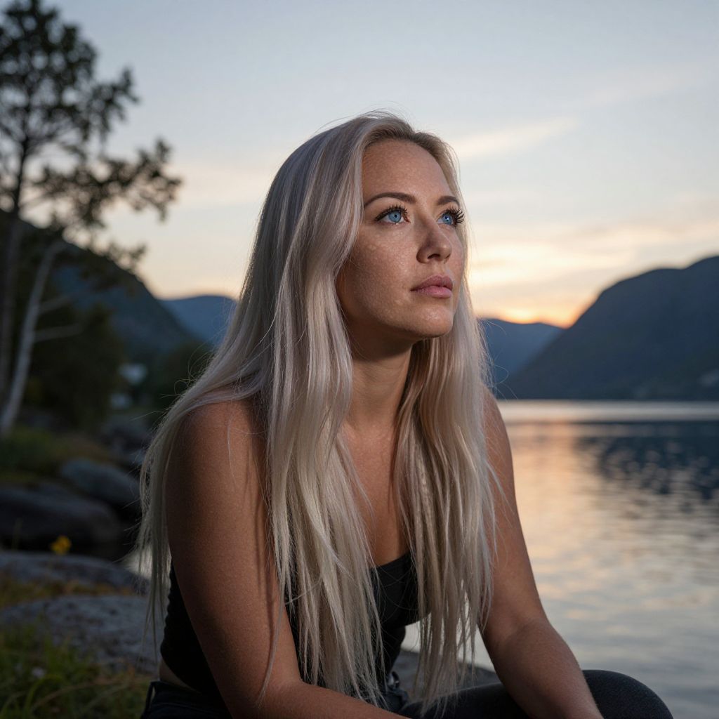Photograph of a young Caucasian woman with long, platinum blonde hair and fair skin, sitting by a calm lake at sunset. She has blue eyes, subtle makeup, and is wearing a black sleeveless top. The background shows a serene lake with a reflective surface, dark silhouettes of trees and distant mountains, and a sky transitioning from orange to blue. She gazes slightly to the right with a contemplative expression. The lighting highlights her hair and facial features, creating a soft, natural glow. The overall scene exudes tranquility and introspection.