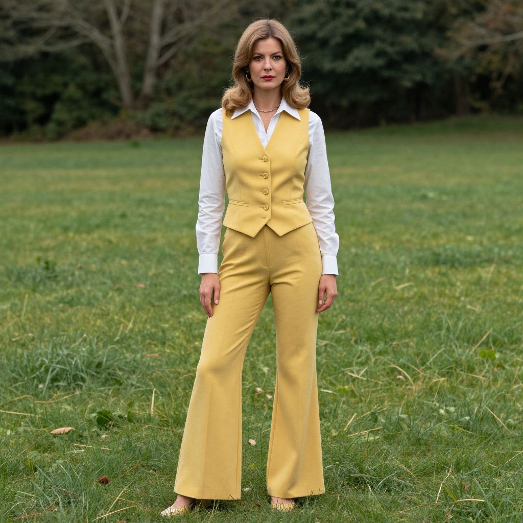 Photograph of a Caucasian woman standing in a grassy field with a forested background. She has light brown, wavy hair and a serious expression. She wears a white long-sleeved blouse with a yellow vest and matching yellow trousers, buttoned up. The outfit is formal and stylish. Her hands rest by her sides, and she stands barefoot on the green grass. The background is blurred, emphasizing her as the focal point. The lighting is natural, highlighting her attire and the greenery around her.
