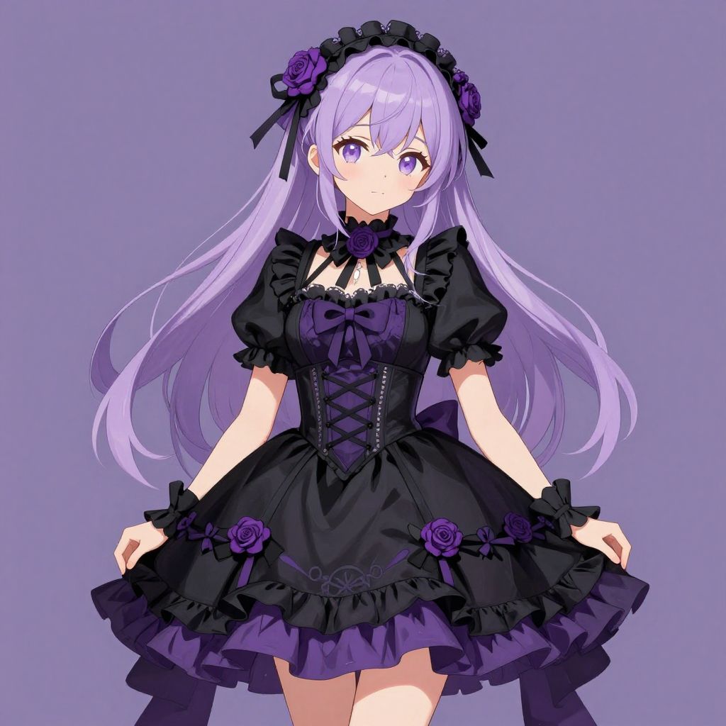 Illustration of an anime-style girl with long lavender hair wearing a black and purple Gothic Lolita dress. The dress features puffed sleeves, corset lacing, and frilled details, accessorized with a matching choker and headpiece adorned with purple roses. The character poses confidently against a muted purple background.