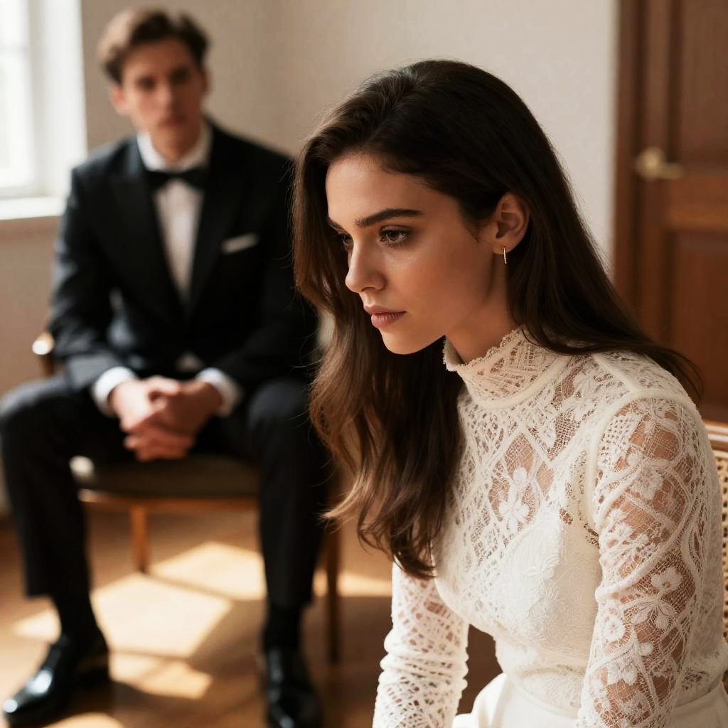 Photograph of a man in a black suit sitting on a chair, writing in a book, and a woman in a white lace dress sitting on another chair, biting her finger. Man has short, slicked-back hair and intense focus. Woman has dark hair in a bun, anxious expression, and white lace dress with three-quarter sleeves. Background has white paneled doors and wooden floor. Man in left background, woman in right foreground.