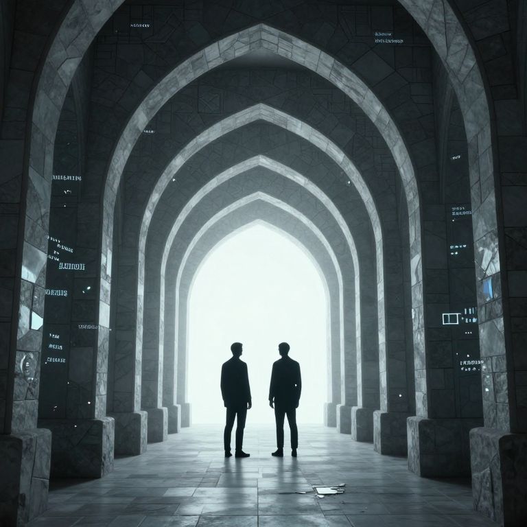 In a surreal 3D-rendered corridor of interwoven stone arches and geometric patterns, two silhouetted figures stand at the end of a luminous path, evoking a cyberpunk-inspired vision where reflections in the mirrored walls seem sentient, offering cryptic riddles in exchange for fragments of one's most vivid imagination.
