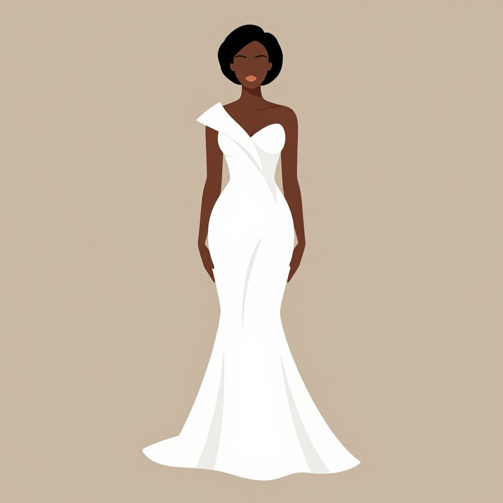 A stylized vector illustration depicts an African woman elegantly dressed in a flowing white evening gown, showcasing a clean, minimalist artistic style with smooth lines and a warm, neutral background.