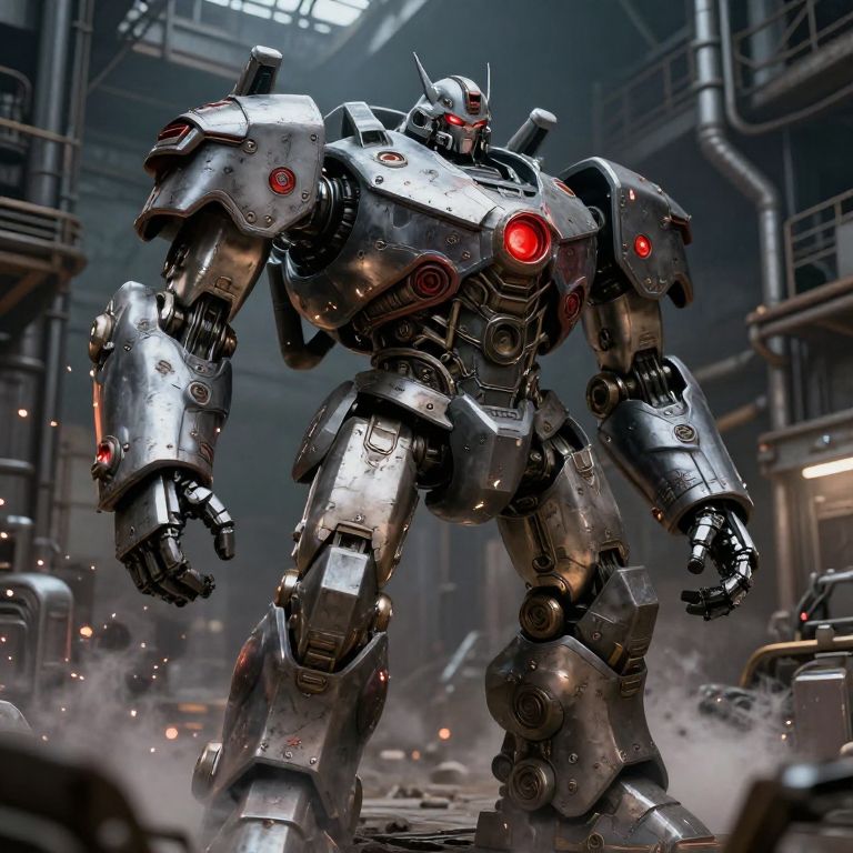 Megaton robot warrior standing in a metallic industrial factory, heavy armor plates detailed with battle scars, glowing red eyes, powerful mechanical limbs, steam and sparks flying around, gritty sci-fi atmosphere, hyper-realistic style