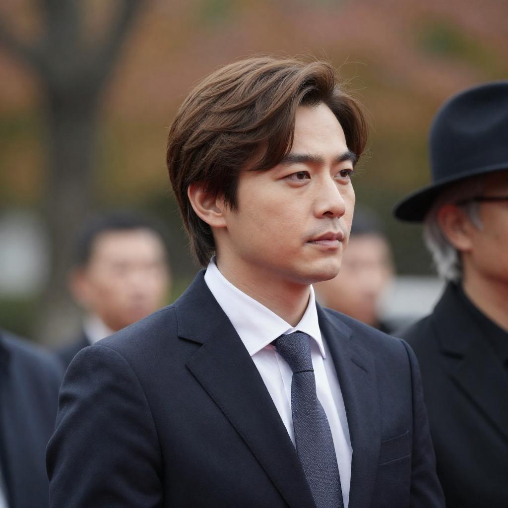 Close-up portrait of a serious Asian man with dark brown hair wearing a gray jacket over a patterned shirt, looking intently at another person. The background features blurred colorful lights creating a dramatic effect, indicating an indoor environment.