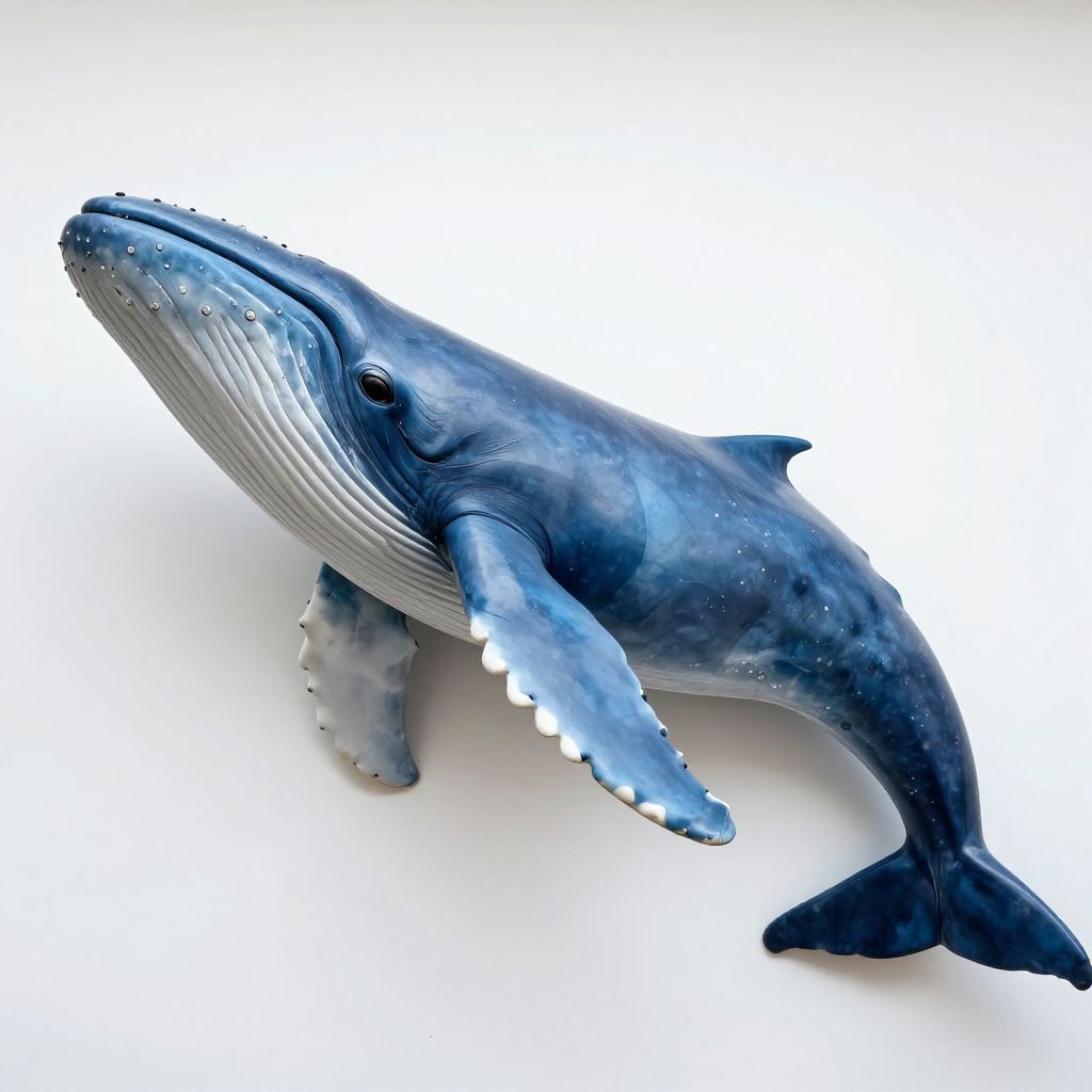 Photograph of a detailed, colorful plastic toy humpback whale with blue and gray hues, white underbelly, and realistic textures, set against