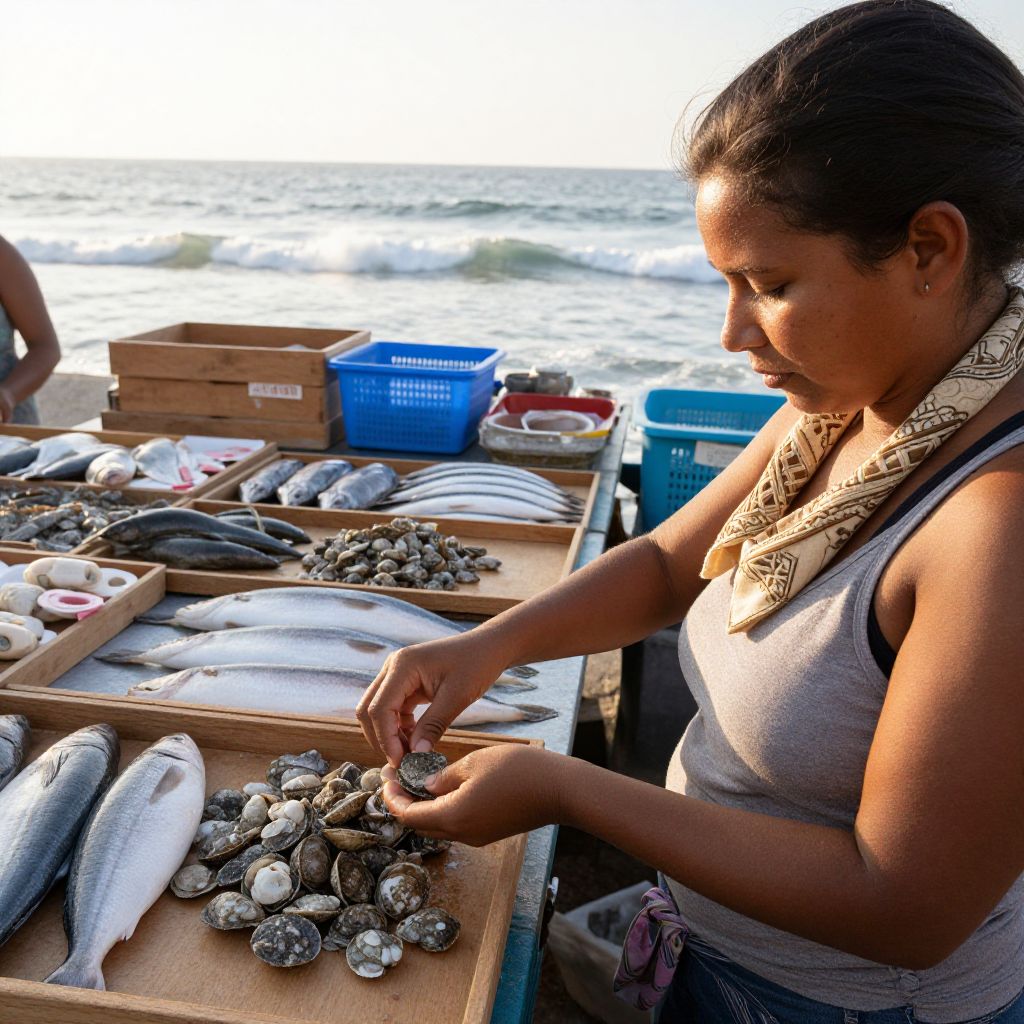 A morning market background in a coastal region, with fish stalls and seafood displayed on wooden planks, a woman with soft brown skin, kind face, and a woven handkerchief around her neck, gently inspecting shellfish, while the ocean is visible in the distance with soft waves and early sunlight reflecting off the water.