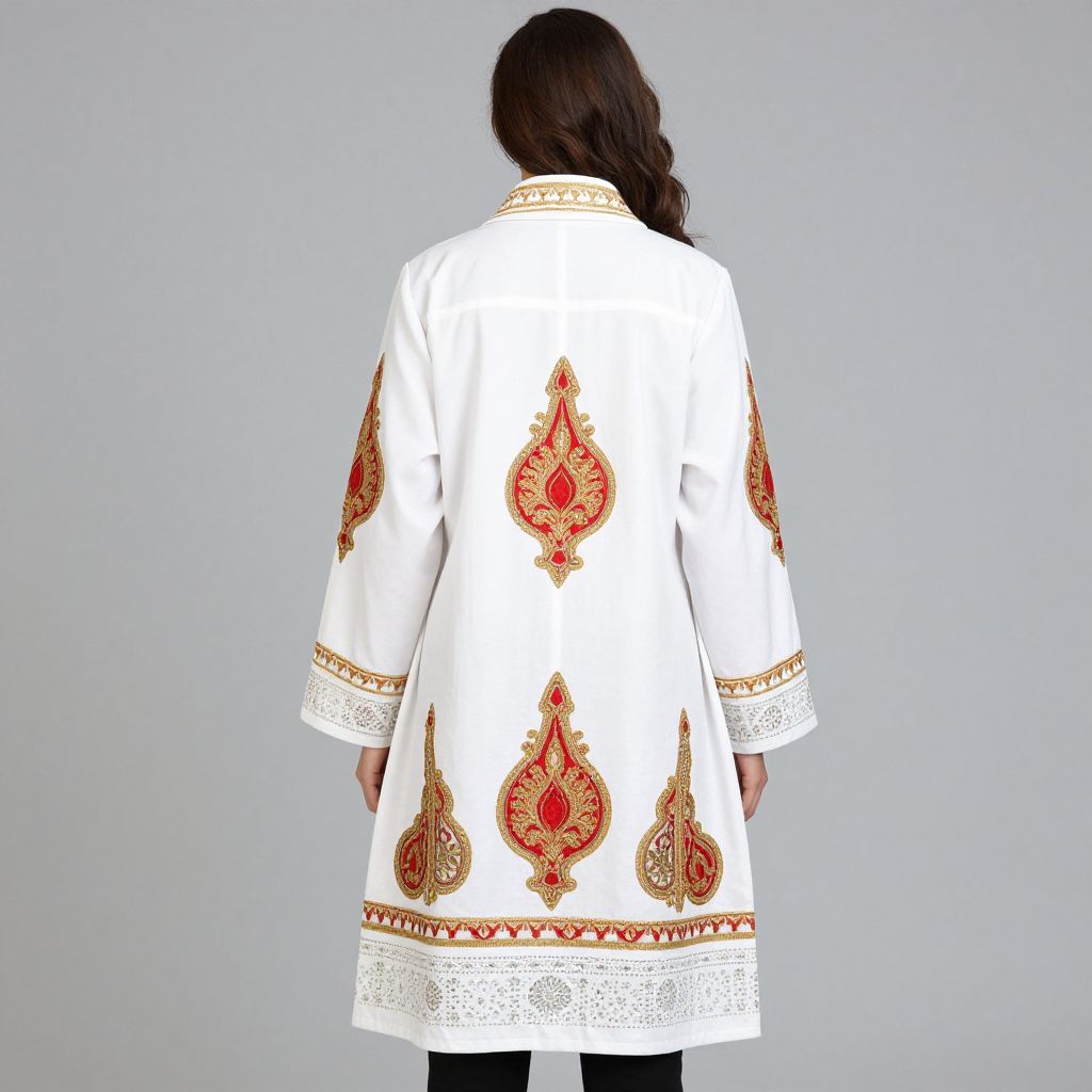 Back view of a woman wearing a pristine white Kashmiri coat adorned with intricate boteh embroidery featuring vibrant red and gold patterns, complemented by subtle embellishments on the cuffs and hem.