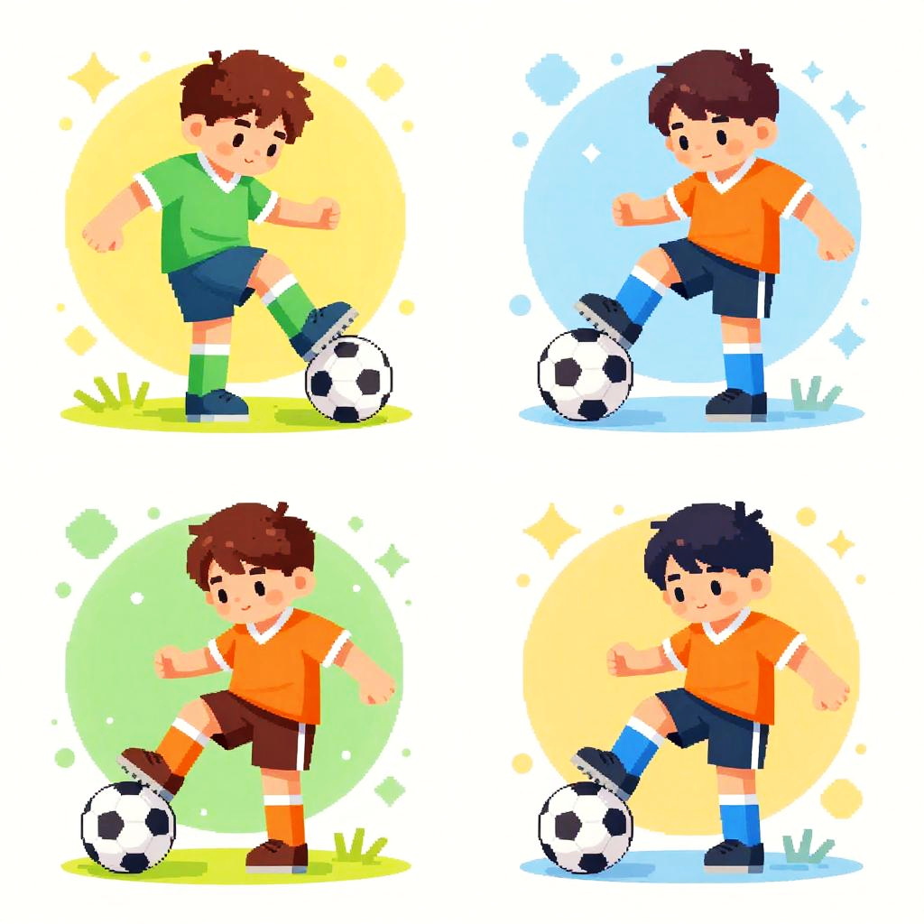 This digital illustration features a cartoon-style depiction of a young boy playing soccer in four different poses, one in each quadrant. The boy has brown hair, a fair complexion, and is shown in a colorful, simplified art style with bold outlines and bright colors. He wears an orange soccer jersey with white trim, dark blue shorts, orange socks, and black soccer cleats. In the top left, he's in a green background, kicking a black-and-white soccer ball with his right foot. In the top right, he's in a blue background, preparing to kick the ball with his left foot. The bottom left and bottom right quadrants mirror the top poses but with different backgrounds—green and yellow, respectively. The grassy patches under his feet add a touch of realism. The overall style is playful and vibrant, with a focus on movement and action.