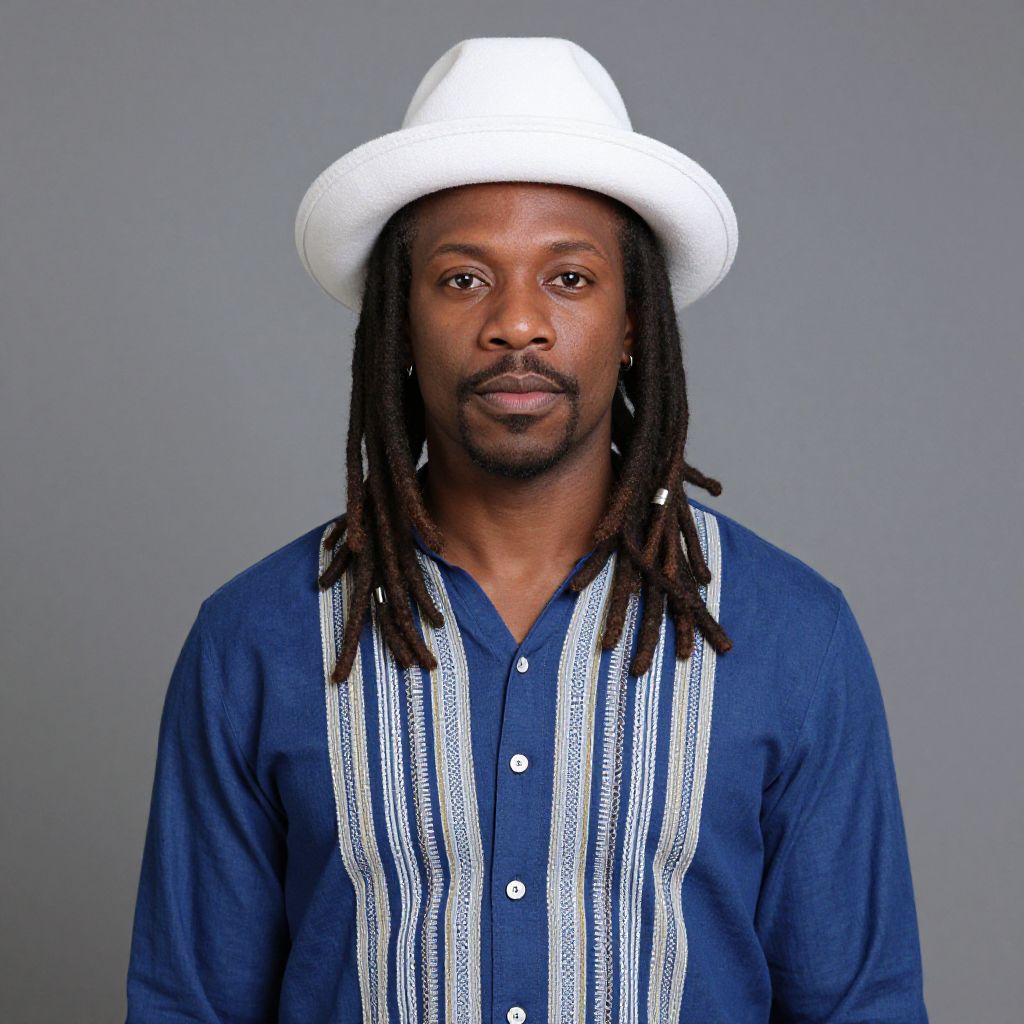 Photograph of a Black man with dark brown skin and medium build, wearing a white cowboy hat and a deep blue, long-sleeve shirt with white vertical stripes down the front. His dreadlocks fall to his shoulders, and he has a short, trimmed beard and mustache. The background is a solid, muted gray, making him the central focus. He looks directly at the camera with a neutral expression. The image is well-lit, highlighting the textures of his shirt and hat.