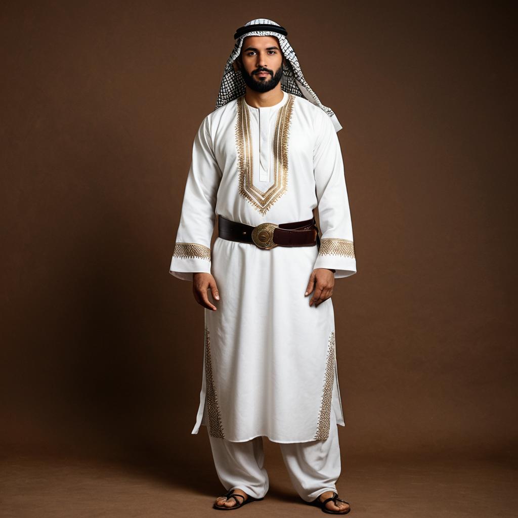 Portrait of a Middle Eastern man standing in front of an ornate building with intricate architectural details. He is wearing traditional Arabian clothing, including a white keffiyeh, a gold-embroidered white tunic, a brown waist belt with a circular emblem, white trousers, and matching brown and gold arm bands. The setting features warm daylight and rich cultural designs.
