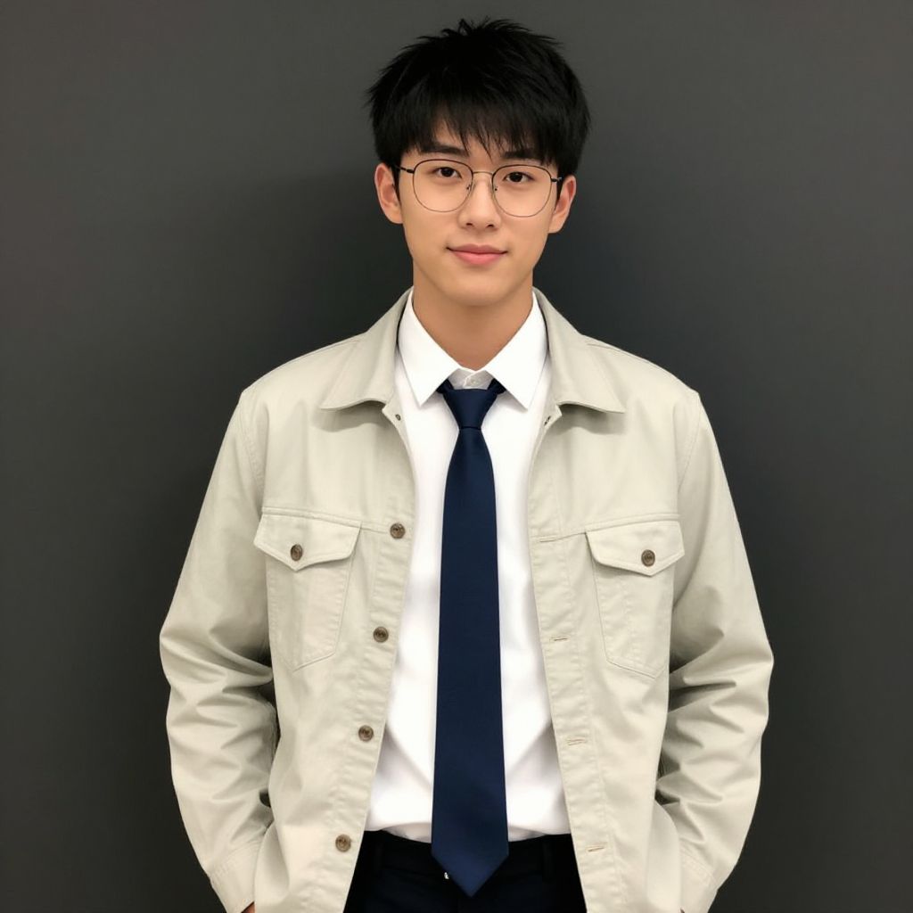 Photograph of an East Asian man with short, tousled black hair and glasses, standing against a solid black background. He is wearing a light beige, button-up, long-sleeve shirt with chest pockets over a white dress shirt and a dark navy tie. His hands are casually placed in his pants pockets. The lighting is even, highlighting his smooth, fair skin and the crispness of his attire. The overall style is modern and professional, with a slight casual touch due to the relaxed positioning of his hands.