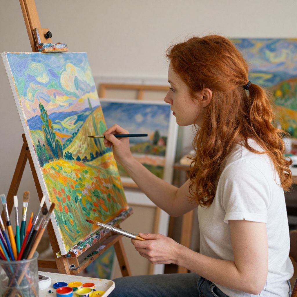 Woman with red hair painting a vibrant landscape in a sunlit studio, surrounded by colorful brushes and canvases, soft natural light highlighting her focused expression, impressionist style with warm and vivid colors.