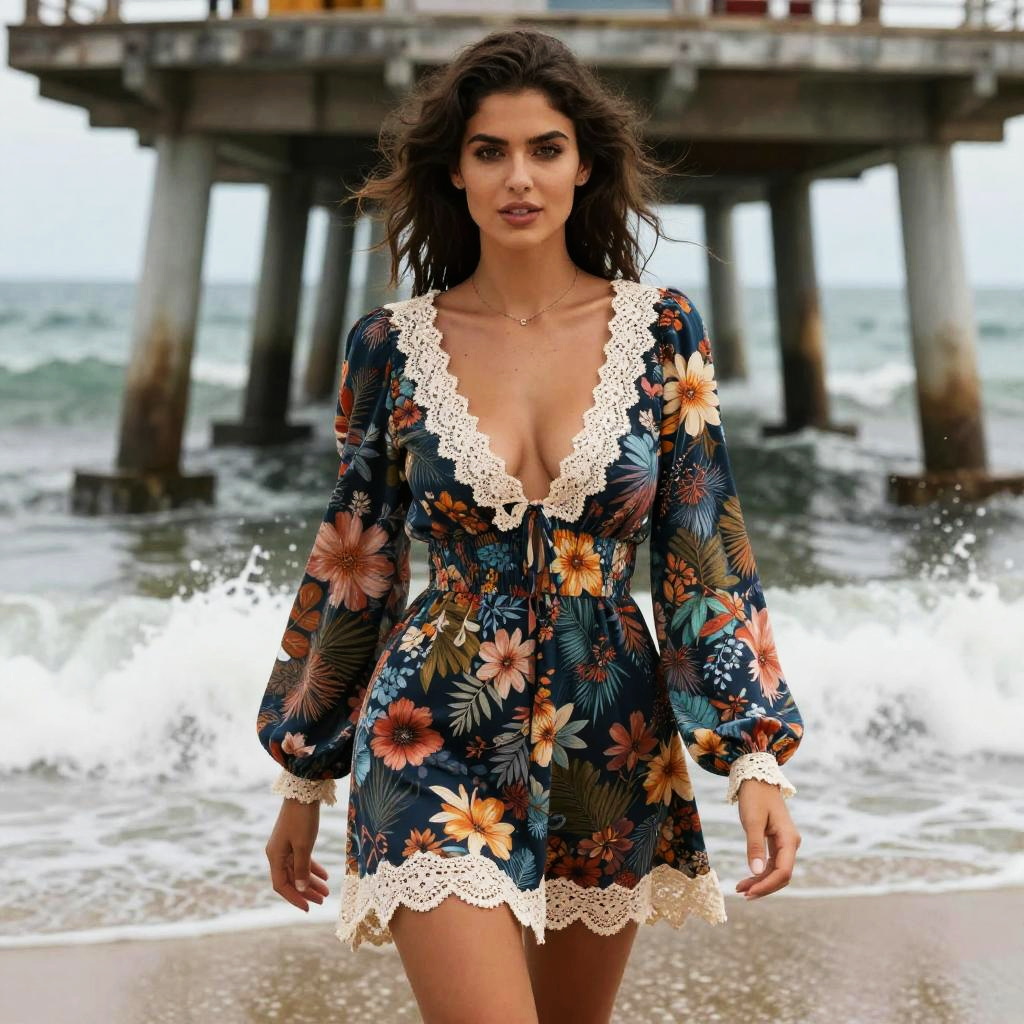 A busty woman in a bohemian floral mini dress with long sleeves and lace trim, standing on a pier with waves crashing around her, in a drawn and quarterly visual style. Sexy. Pretty face and beutiful eyes