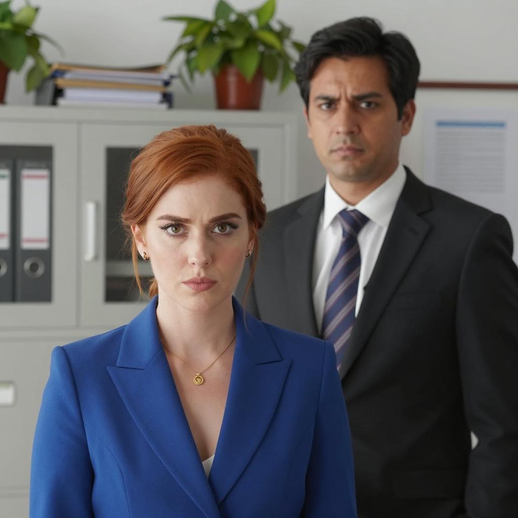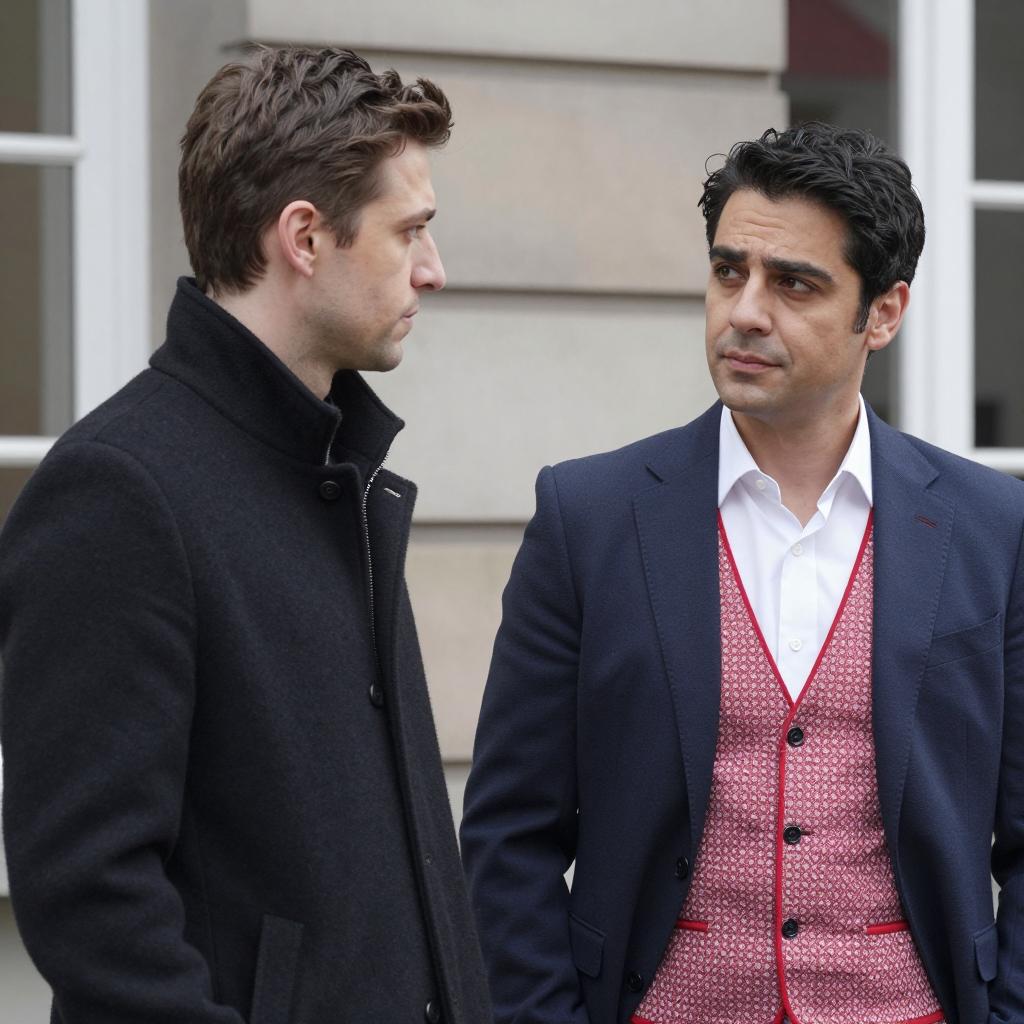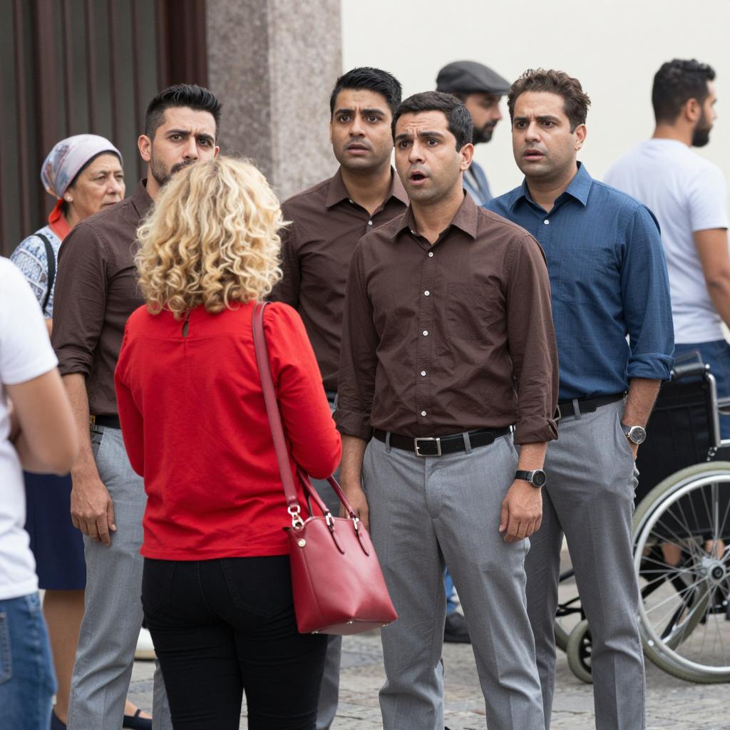 Photograph of a crowded street scene. Five men in brown and blue shirts stand closely together, two with surprised expressions. Blonde woman with curly hair in red top and black pants holds a red handbag. Background includes older woman in headscarf, man in flat cap, and others. Wheelchair with blanket in the background. Men's pants are gray, one man's shirt is buttoned up. Daylight setting.