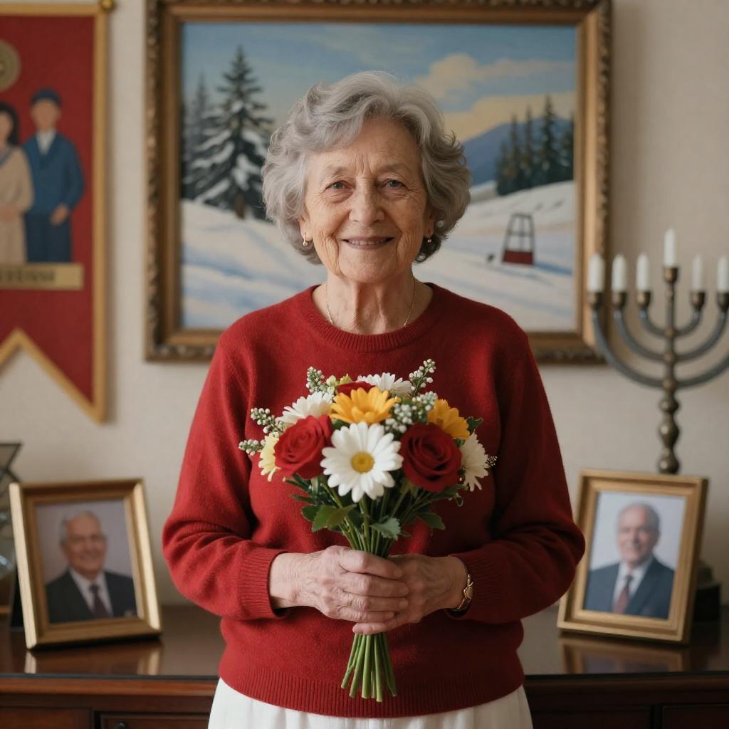 Photograph of an elderly woman with short, white hair, wearing a black jacket and yellow scarf, standing in front of a framed black-and-white photograph of a group of people in formal attire. Background includes warmly lit shelves.
