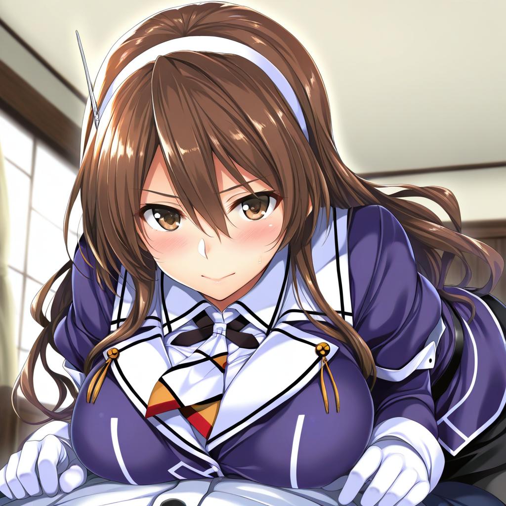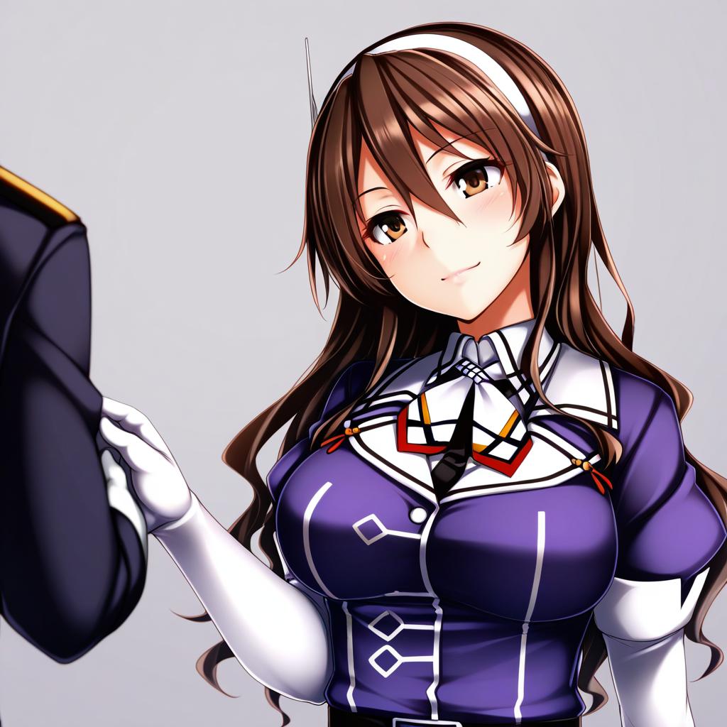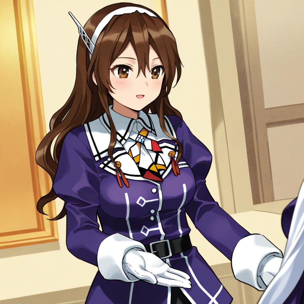 Ashigara kai ni (kancolle), kantai collection, 1girl, brown eyes, hair between eyes, long hair, brown hair, wavy hair, hairband, large breasts, military uniform, uniform, white gloves, by artist ouhara lolong, animagine