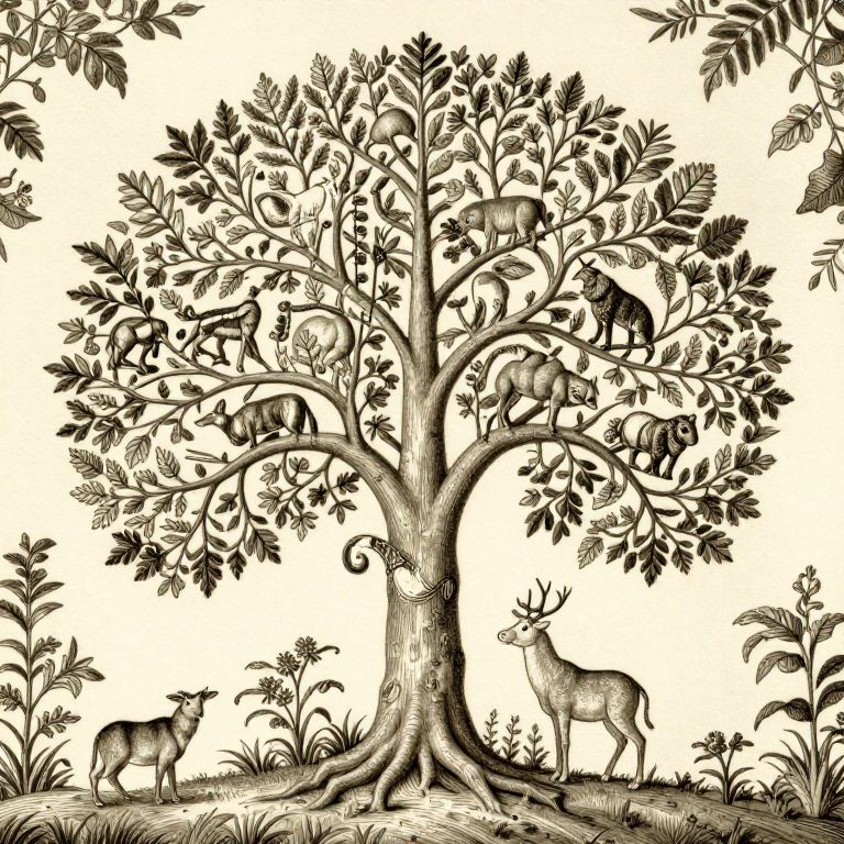 Black and white illustration of a tree with birds, deer, and a rabbit, detailed foliage, and textured trunk.
