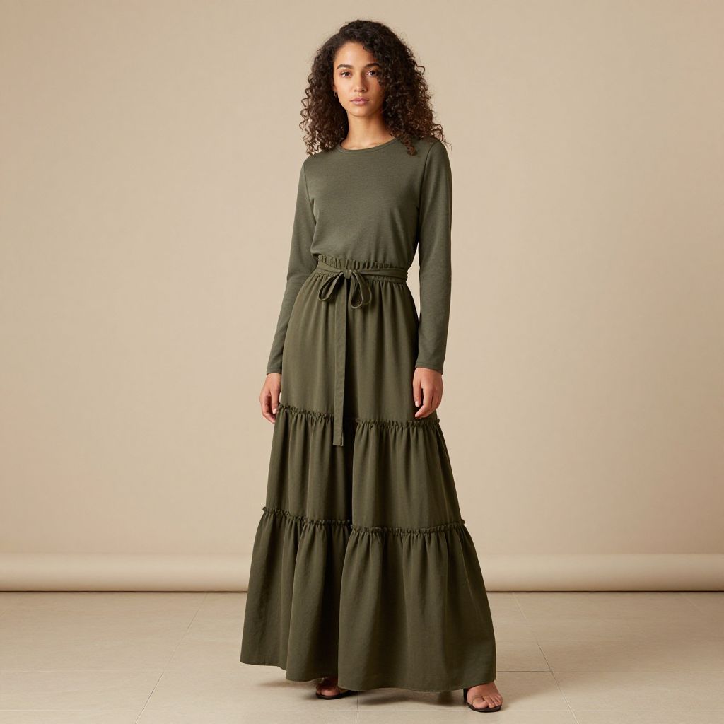Portrait of a smiling middle-aged woman with brown hair wearing a long olive green skirt and matching long-sleeved top. She stands against a plain beige background, accessorized with a delicate necklace, earrings, and a bracelet, wearing black sandals.