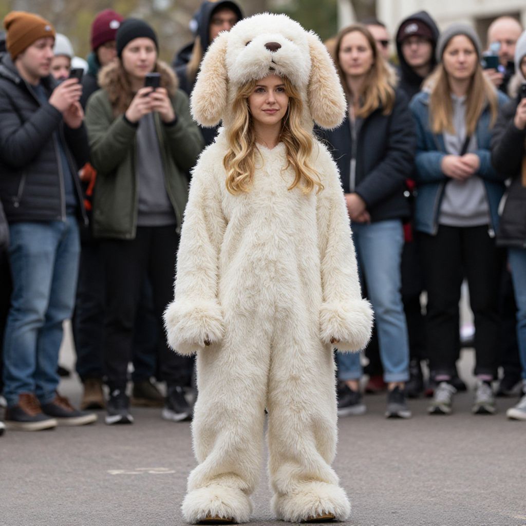 Photograph of a young blonde girl standing in the center, wearing a full-body, cream-colored, fluffy dog costume with floppy ears and a black nose. She has a slight smile and wavy hair. In the background, a group of people, mostly teenagers, are standing and taking pictures with smartphones. They are dressed in casual winter clothing, including jackets, hats, and jeans. The setting appears to be an outdoor event on a gray, overcast day, with a blurred, indistinct background suggesting trees and buildings. The image has a candid, documentary-style feel.