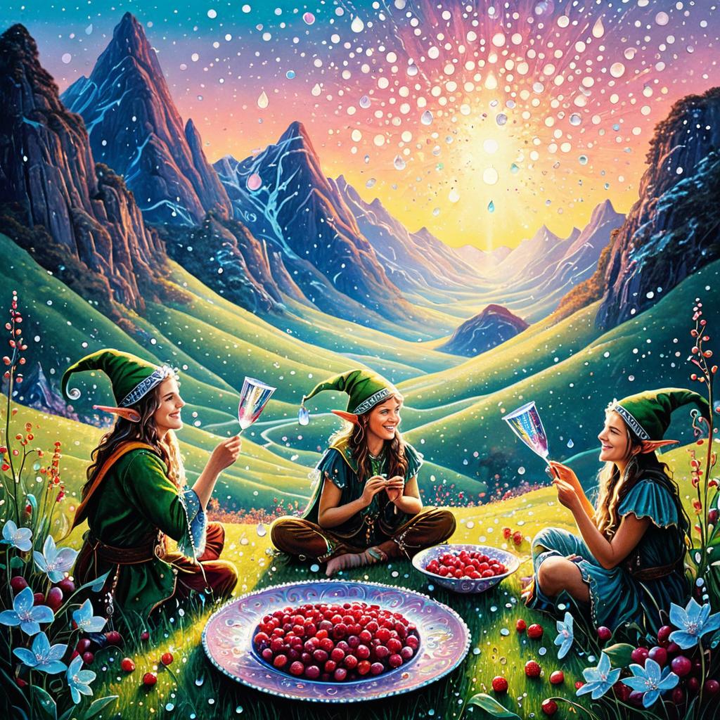 Whimsical painting of four joyful elves with pointed ears and floral crowns, gathered around a table with bowls of vibrant red and dark berries. They are dressed in green and blue fantasy robes and hats, toasting with delicate glasses in a crystalline valley during sunrise. The scene features glittering dew droplets, mountain landscape, and radiant sunlight, evoking a magical and harmonious morning ritual.