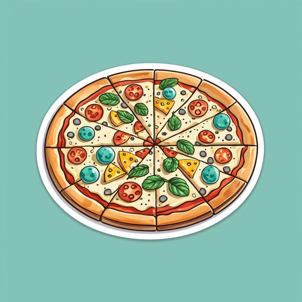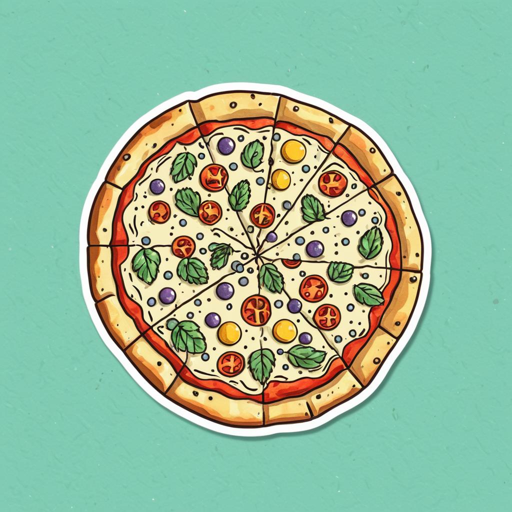 STICKER, solid mint background, SHARP FOCUS of A Detailed watercolor cute whole pizza, Bubble Blast, Rainbow Colors, Redbubble Sticker, Splash In Vibrant Colors, 3D Vector Art, Cute And Quirky, Adobe Illustrator, HandDrawn, Digital Painting, LowPoly, Soft Lighting, Bird'sEye View, Isometric Style, Retro Aesthetic, Focused On The Character, 4K Resolution