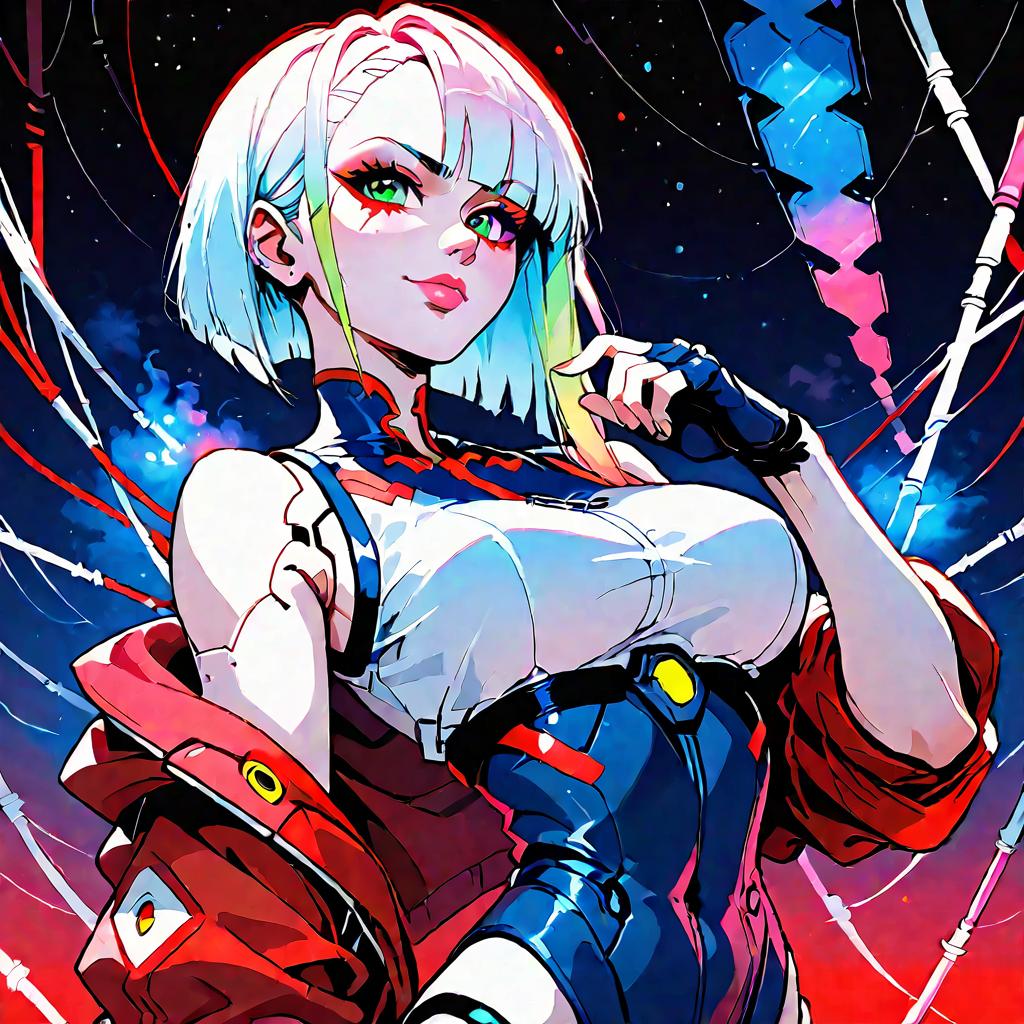 Score_9, score_8_up, score_7_up, robot girl, Lucy (Cyberpunk: Edgerunners), (robot joints, intervention unit, very complex robot, glowing che BREAK 1.2), solo, large breasts, bangs, arched back, dark eyes, too tight burgundy hoodie, provocative, cosmic background, cables and wires everywhere, smirk, red theme, covered face, carbon tank top, fingerless gloves, female figure, large breasts, arched back, dark eyes, bangs, smirk, tight burgundy hoodie, carbon fiber tank top, fingerless gloves, covered face, red theme, cosmic background, cables and wires, futuristic, cyberpunk, high detail