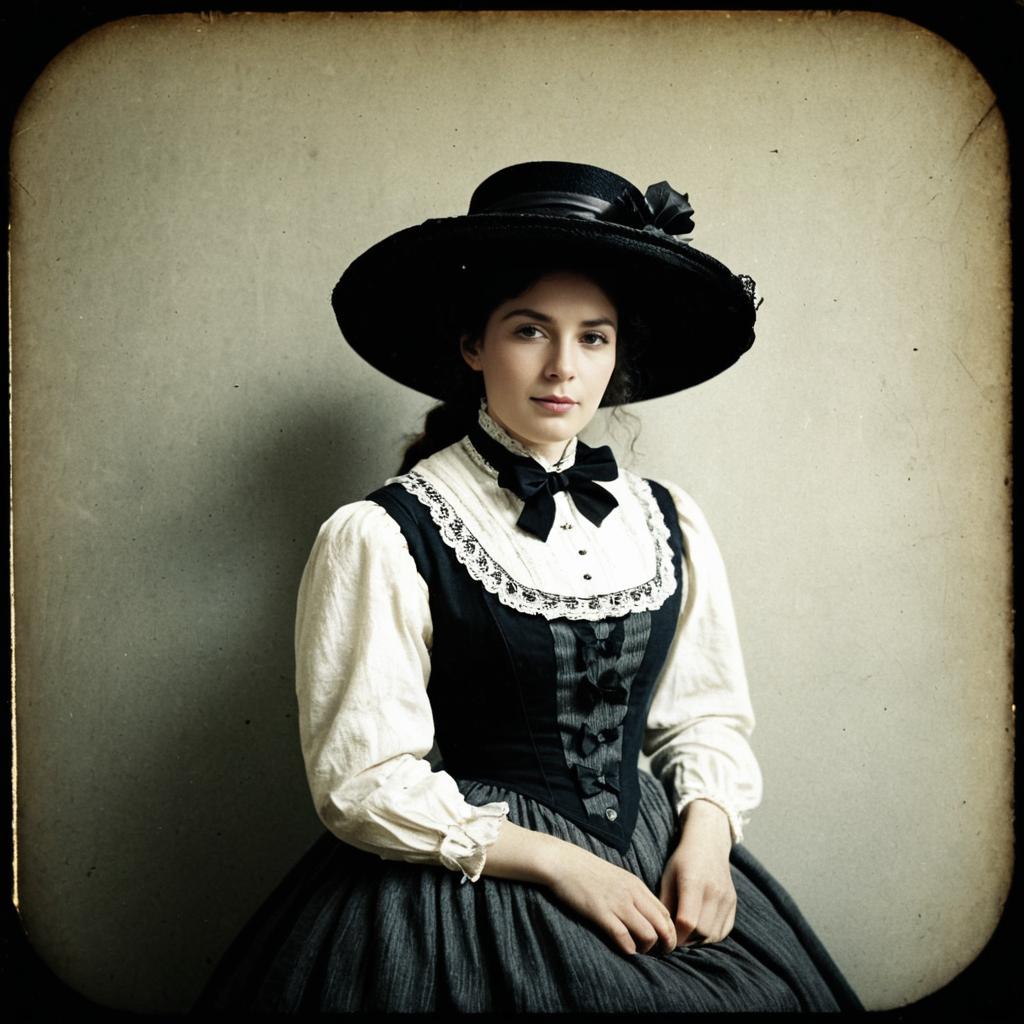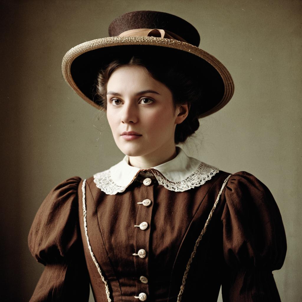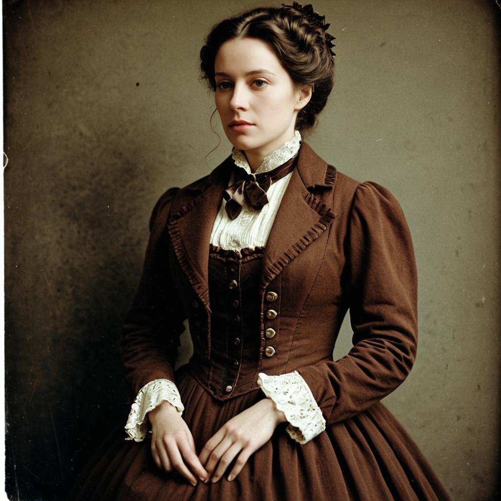 Victorian Era Fashion Costume, woman in a brown dress and a brown jacket