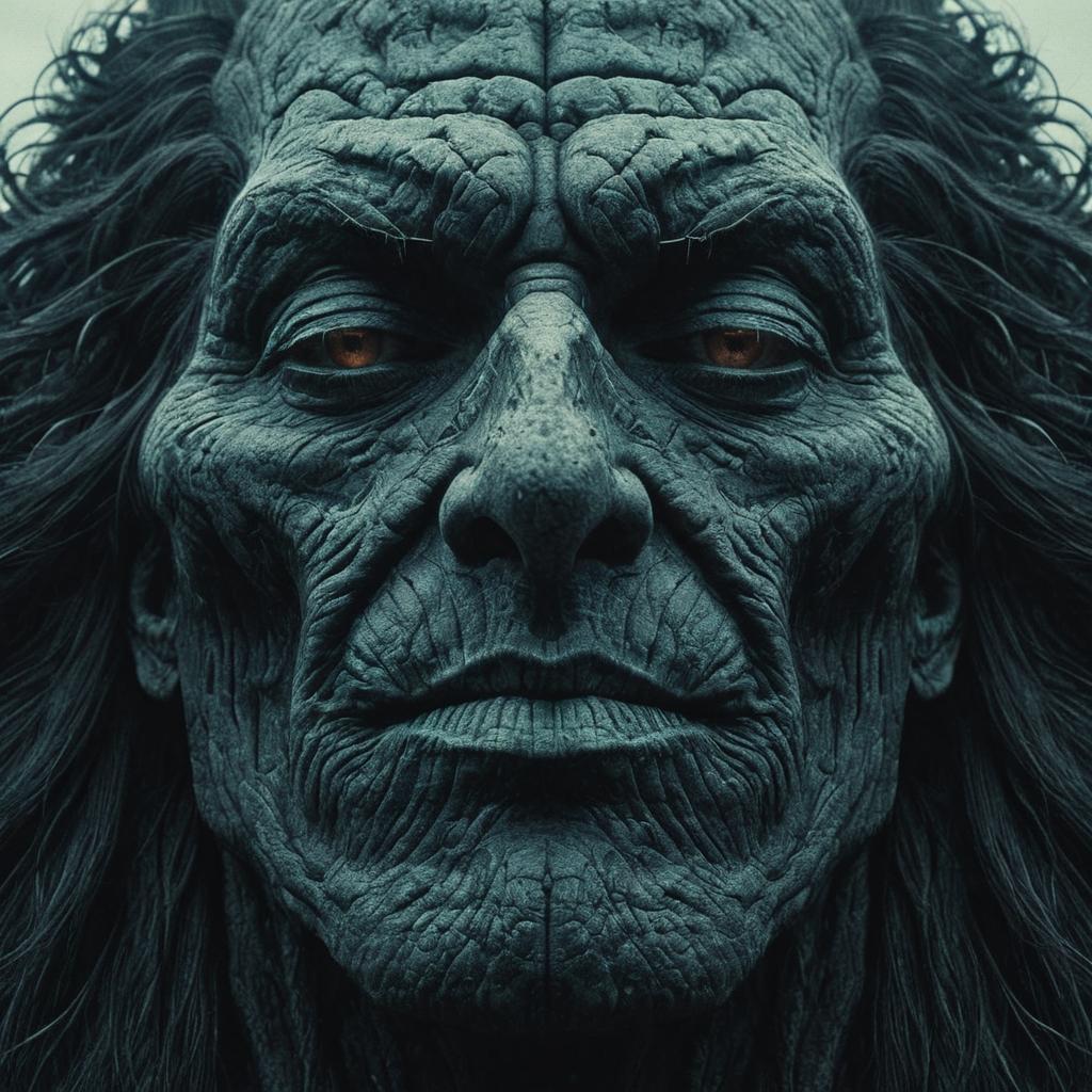 A close-up of a colossal, intricately detailed sculpture featuring an aged face with deep wrinkles and textured skin. The artwork draws inspiration from Zdzisław Beksiński and Beeple, showcasing sharp, ultradetailed features rendered in a dark, haunting style. The eyes are subtly glowing, and the hair flows wildly around the face, enhancing the epic and surreal atmosphere.