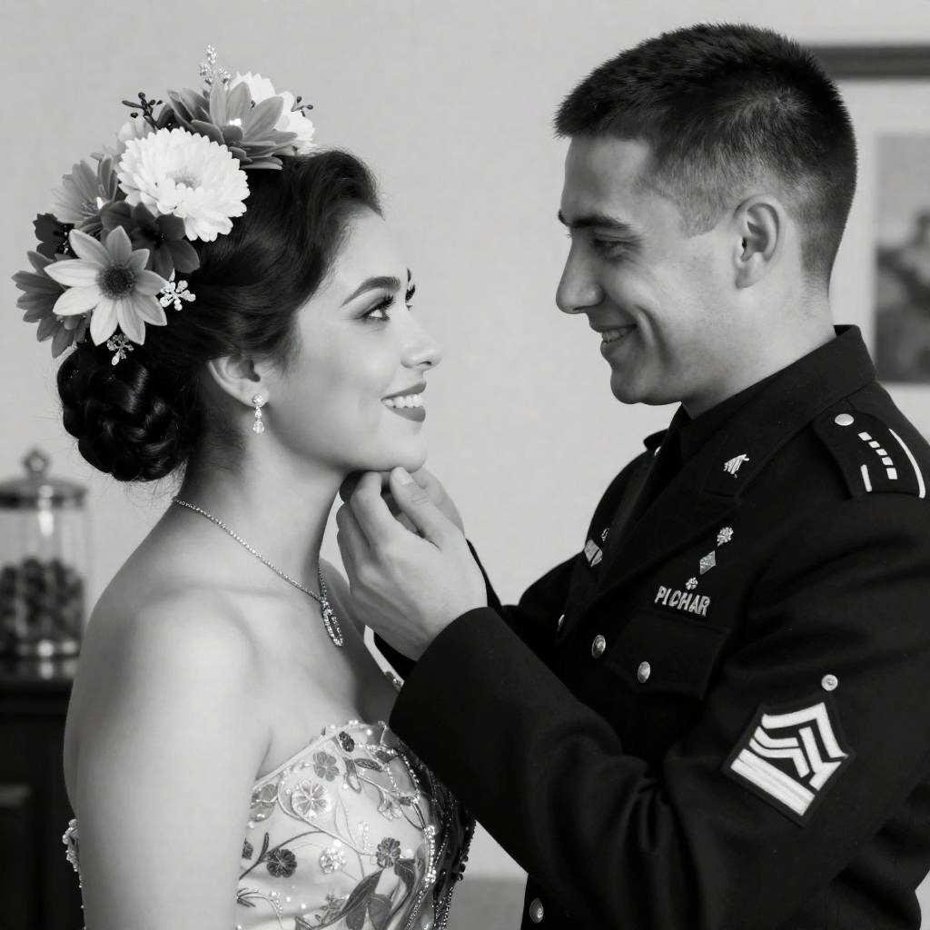 Black-and-white photograph of a man in a military uniform kissing a woman with closed eyes. Man's short, dark hair, light uniform with medals, holding woman's chin. Woman's dark hair, light skin, earrings. Man's intense gaze, woman's relaxed expression. Background is plain. Man on the right, woman on the left.