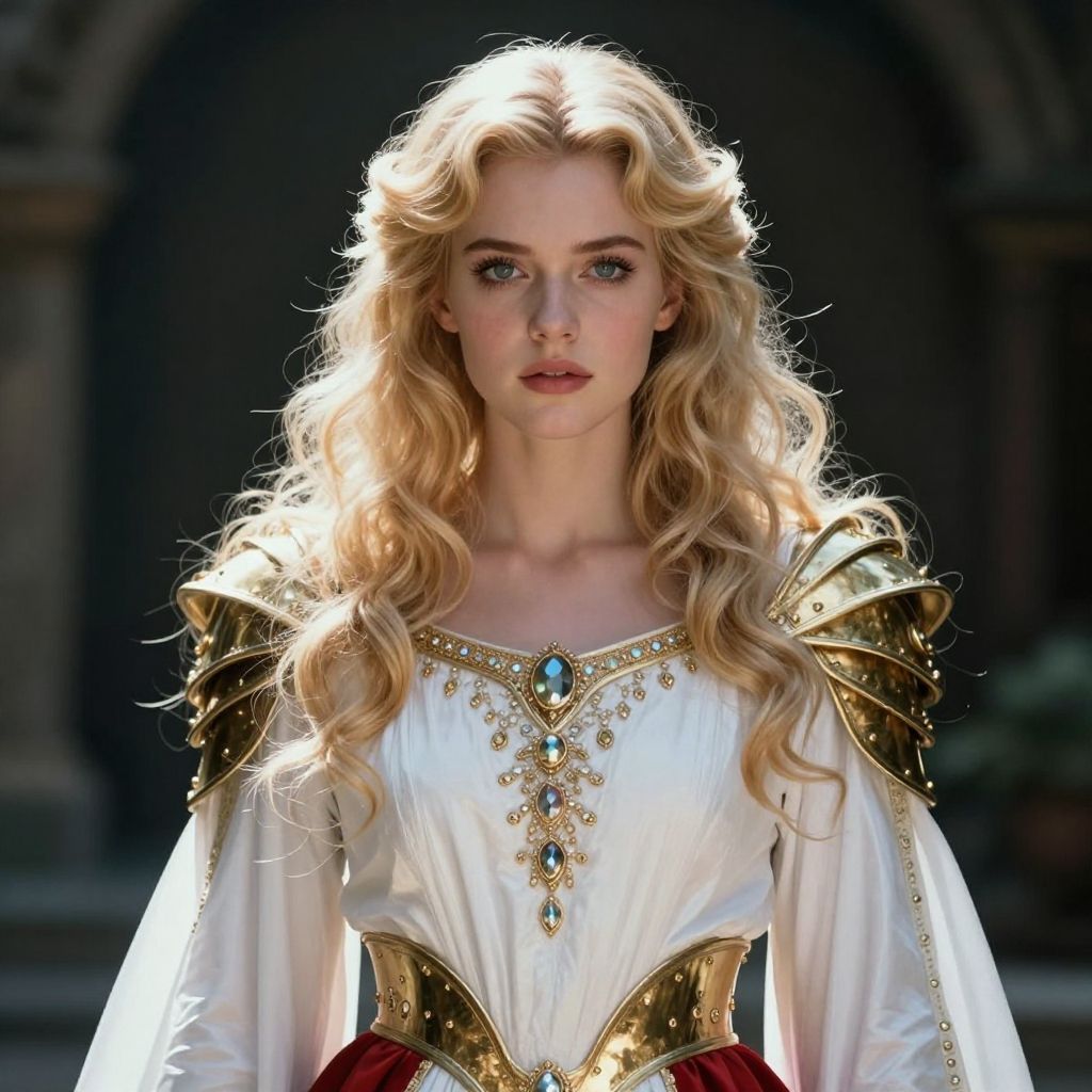 Warrior, realistic, HD, 8k, dress white, 1980s, beauty face, armor gold, skirt red, ((realism)), extremely high quality RAW photograph, ultra detailed photograph, sharp focus, high resolution, (detailed skin:1, 3), high quality, film grain, Fujifilm XT3, Highly Detailed, movie, (Cinematic Photo:1.3) of (Realistic:1.3), (Disgusting:1.3) Photorealism, (Magical Photo:1.3) of (Realistic:1.3), Crystalcore, Bejeweled, ethereal, hyperdetailed fantasy character, Dreamlike, Ethereal Fantasy, Realistic, Fiction, Full-HD, 8K, Soft Lighting, Beautiful Lighting, (Photorealism:1.3), (1girl:0.999), (blonde_hair:0.790), (eyelashes:0.609), (face:0.631), Cinematic photography, movie mood, cinematic light, compelling composition, storytelling elements, conveys emotion, mood, and narrative depth, creating visually striking images that feel like still frames from a film
